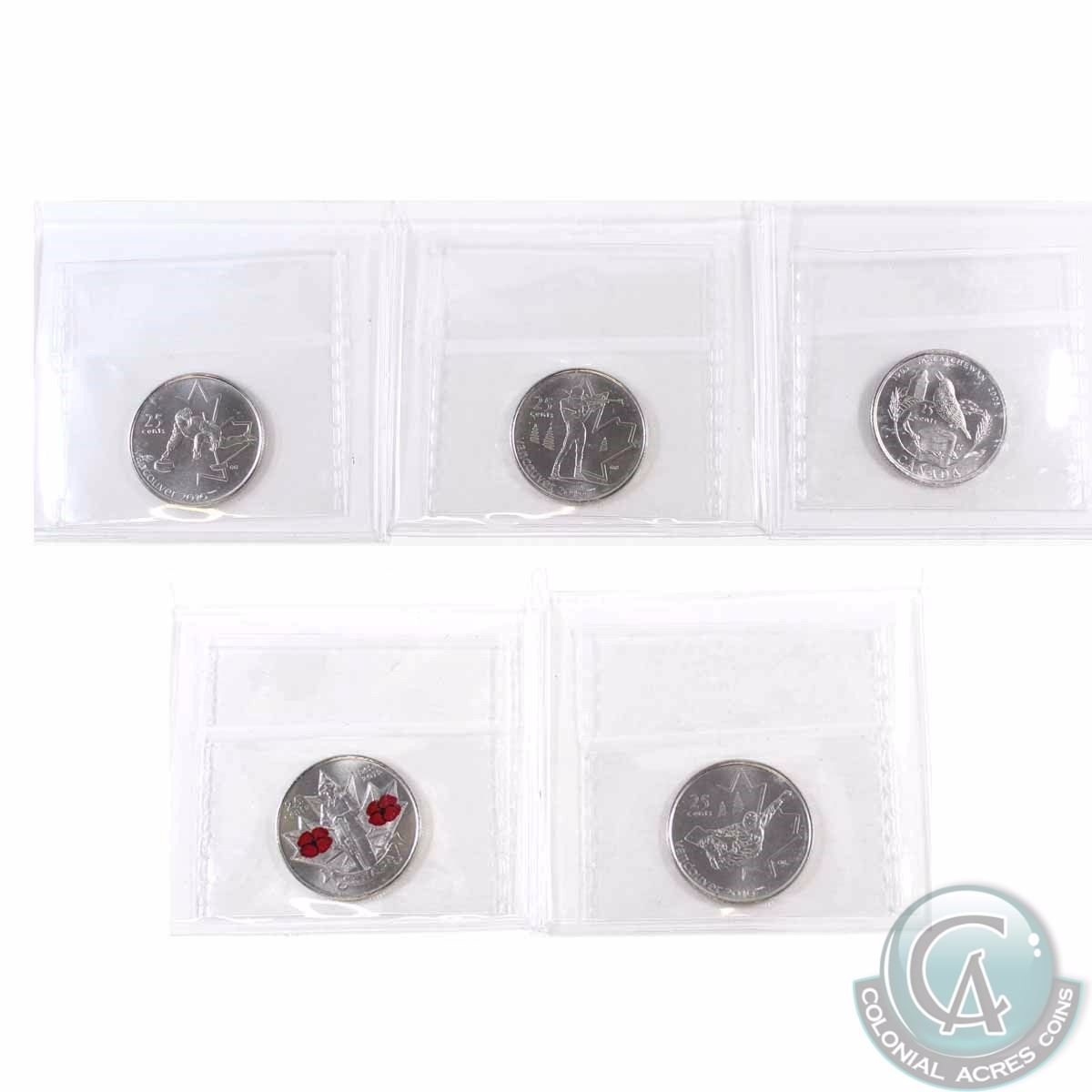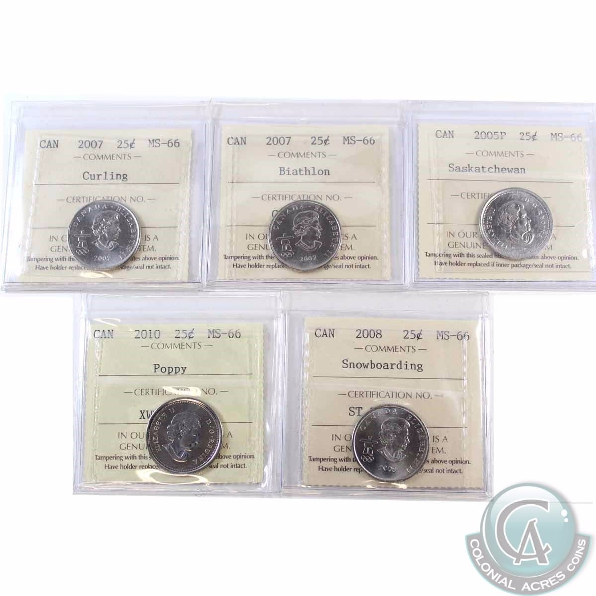 25-cent 2005P Saskatchewan, 2007 Biathlon, 2007 Curling, 2008 Snowboarding & 2010 Poppy ICCS Certified MS-66. 5pcs