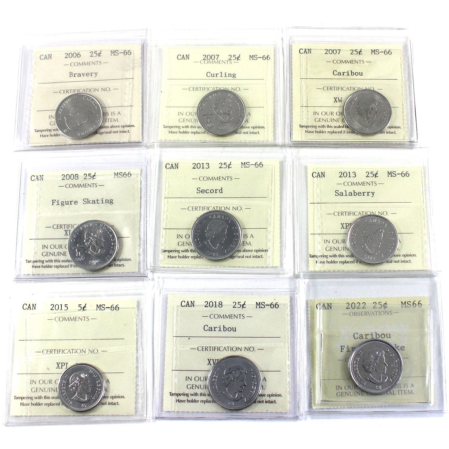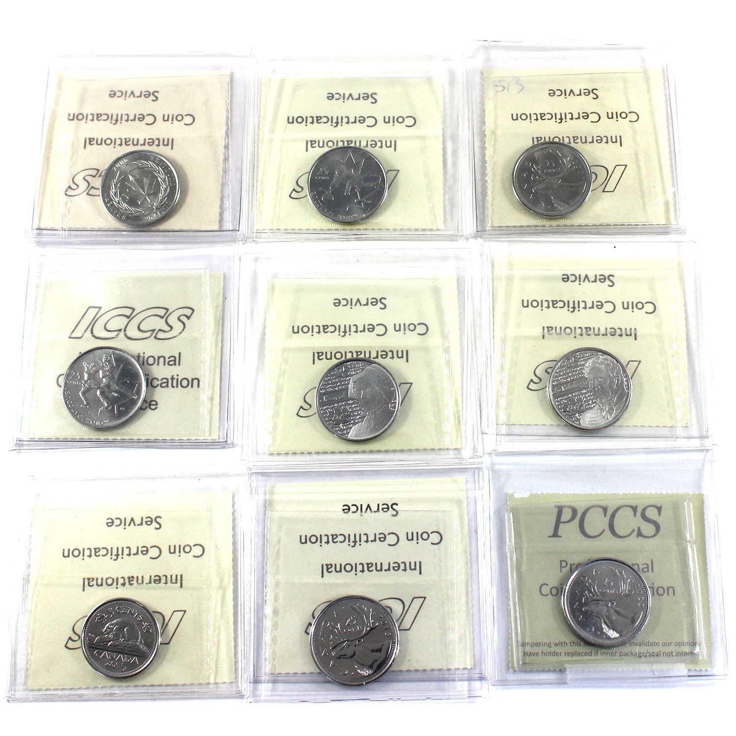 25-cent 2006 Bravery ICCS, 2007 Curling ICCS, 2007 ICCS, 2008 Figure Skating ICCS, 2013 Secord ICCS, 2013 Salaberry ICCS, 2015 ICCS, 2018 ICCS, & 2022 First Strike PCCS (Professional Coin Certification System) Certifed MS66. 9pcs.
