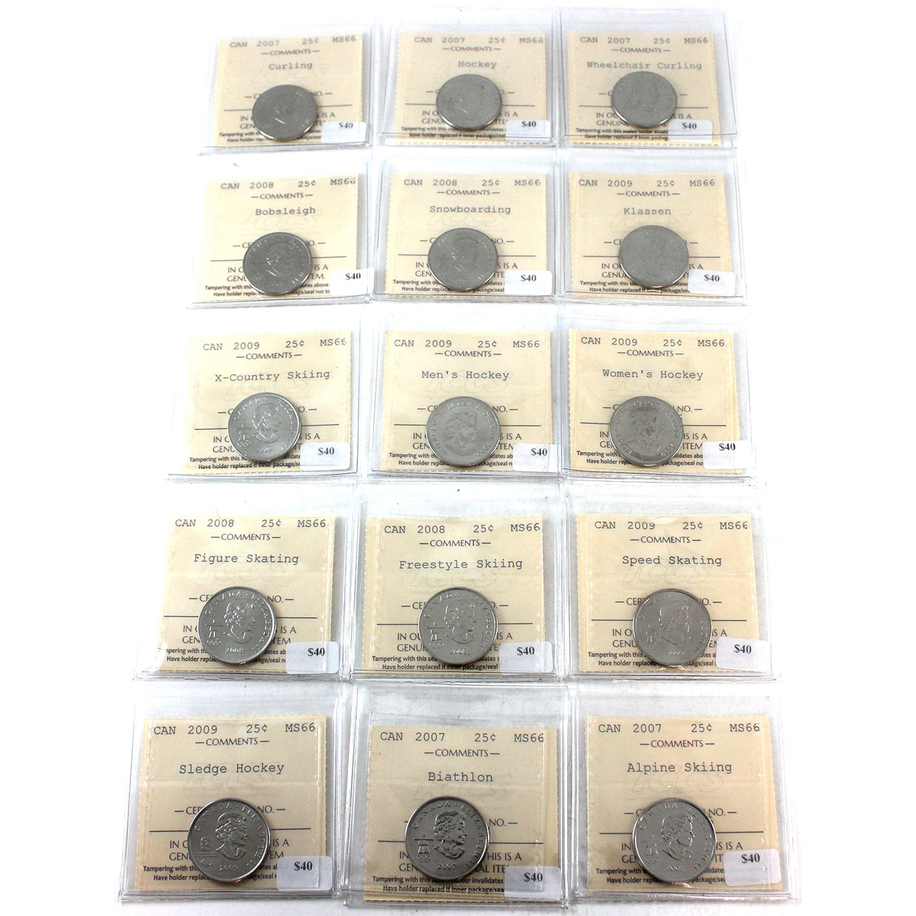 INCLUDES: 2007 Biathlon, Alpine Skiing, Curling, Hockey, Wheelchair Curling; 2008 Bobsleigh, Snowboarding, Figure Skating, Freestyle Skiing; 2009 Speed Skating, Sledge Hockey, Klassen, X-Country Skiing, Men's Hockey, & Women's Hockey. 15pcs.