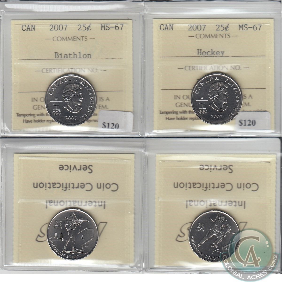 25-cent 2007 Hockey & 2007 Biathlon both ICCS Certified MS-67. 2pcs