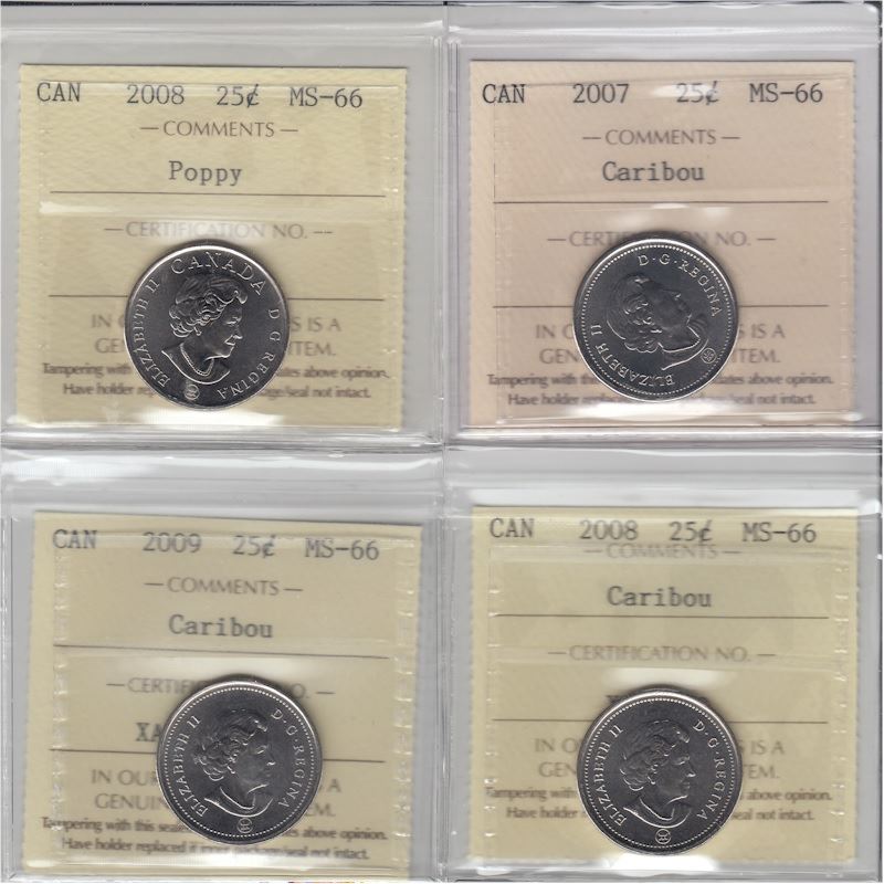 25-cent 2007 caribou, 2008 poppy, 2008 caribou & 2009 caribou ICCS MS66. The 2008 Poppy is tied for