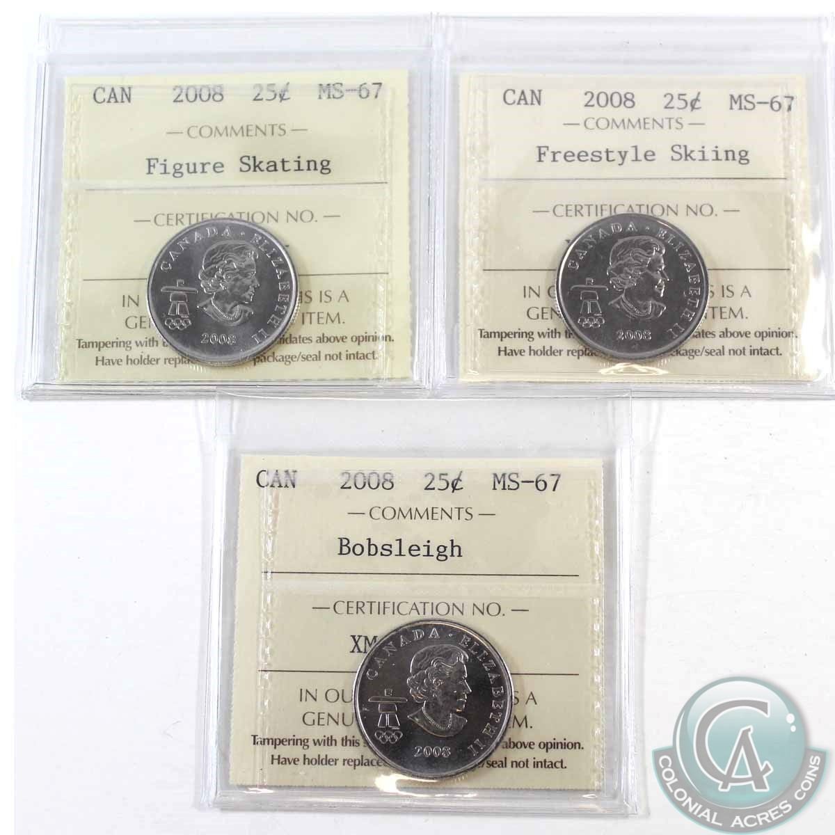 25-cent 2008 Freestyle Skiing, Figure Skating & Bobsleigh ICCS Certified MS-67. All tied for the finest known. 3pcs