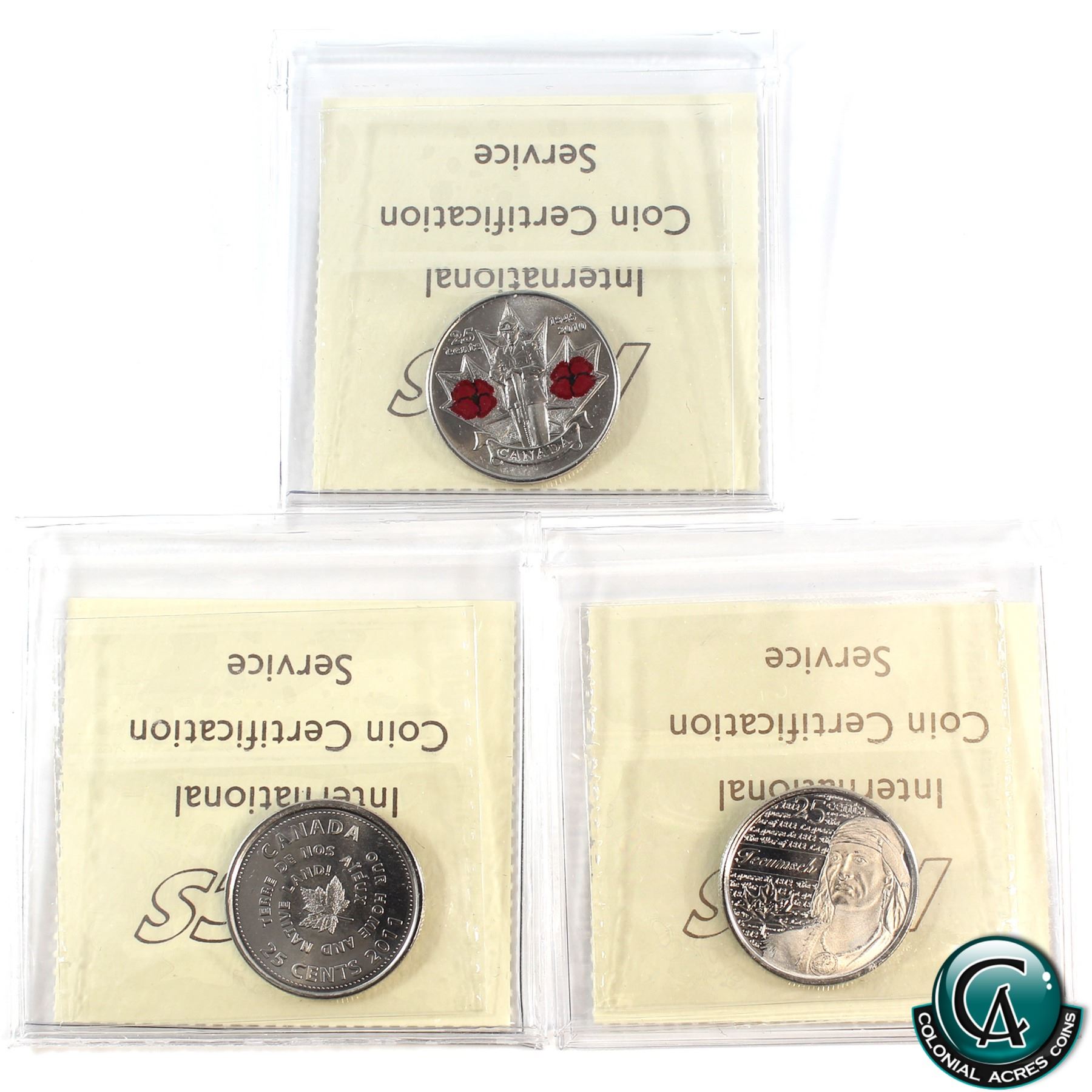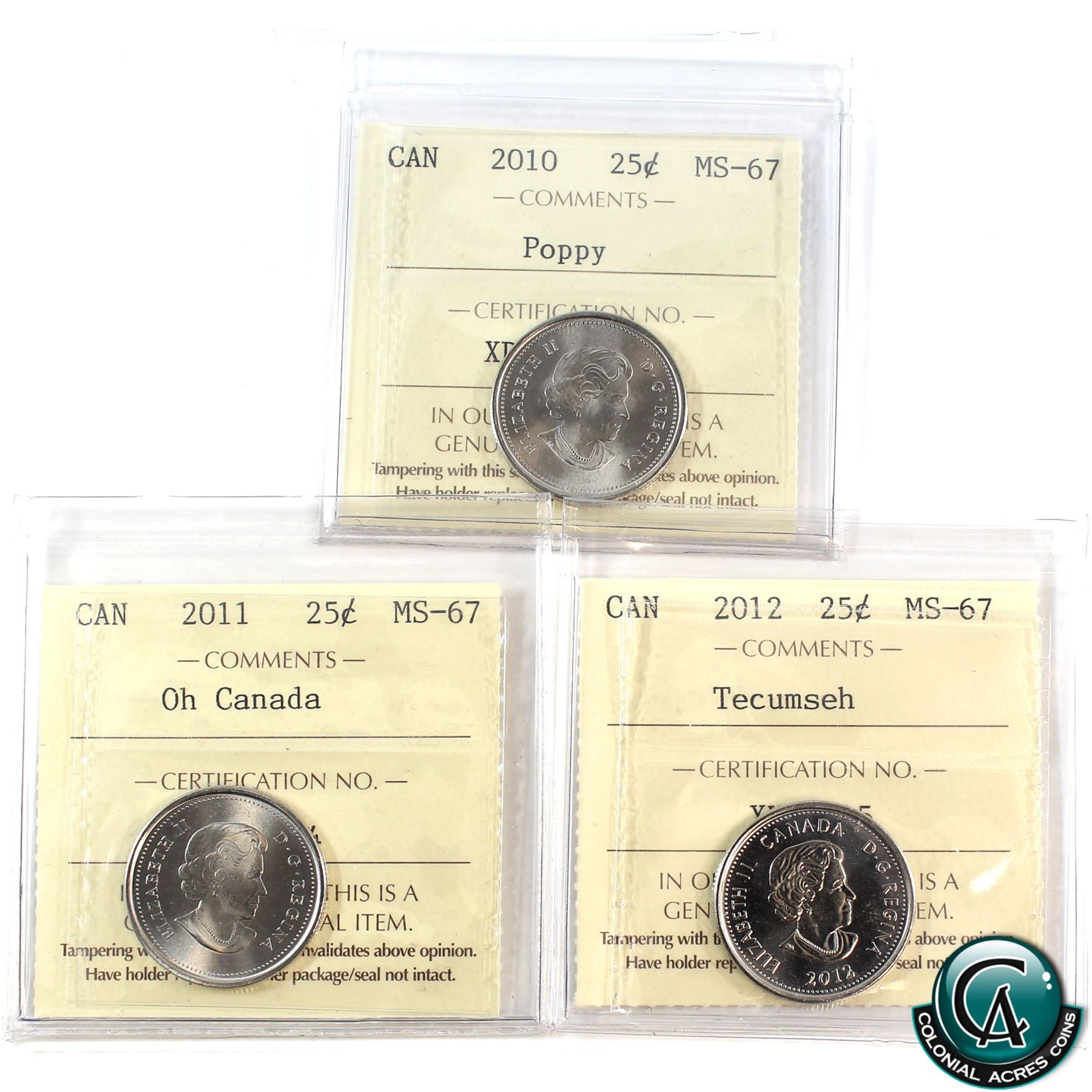 25-cent 2010 Poppy, 2011 Oh Canada & 2012 Tecumseh ICCS Certified MS-67. All coins tied for highest grade. 3pcs