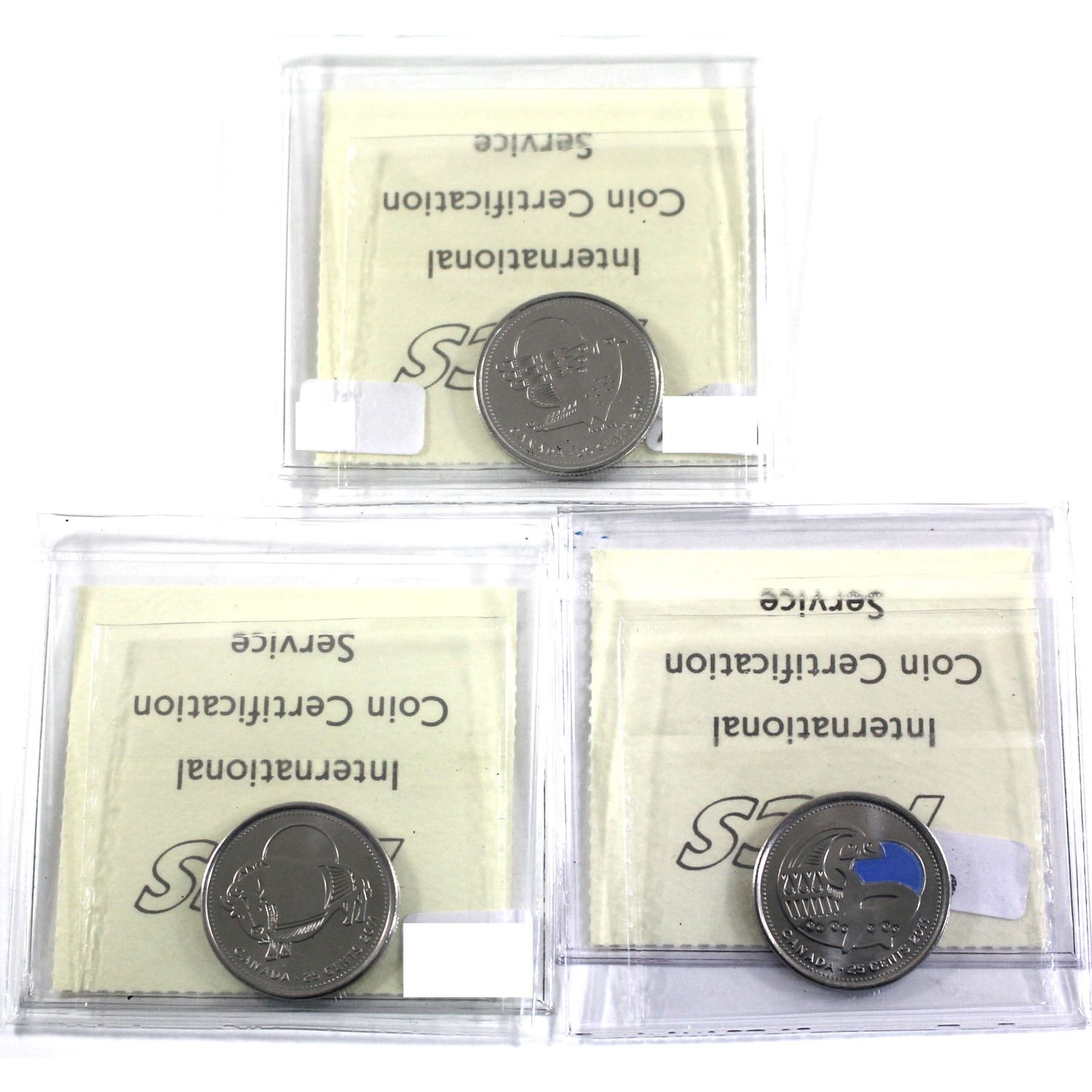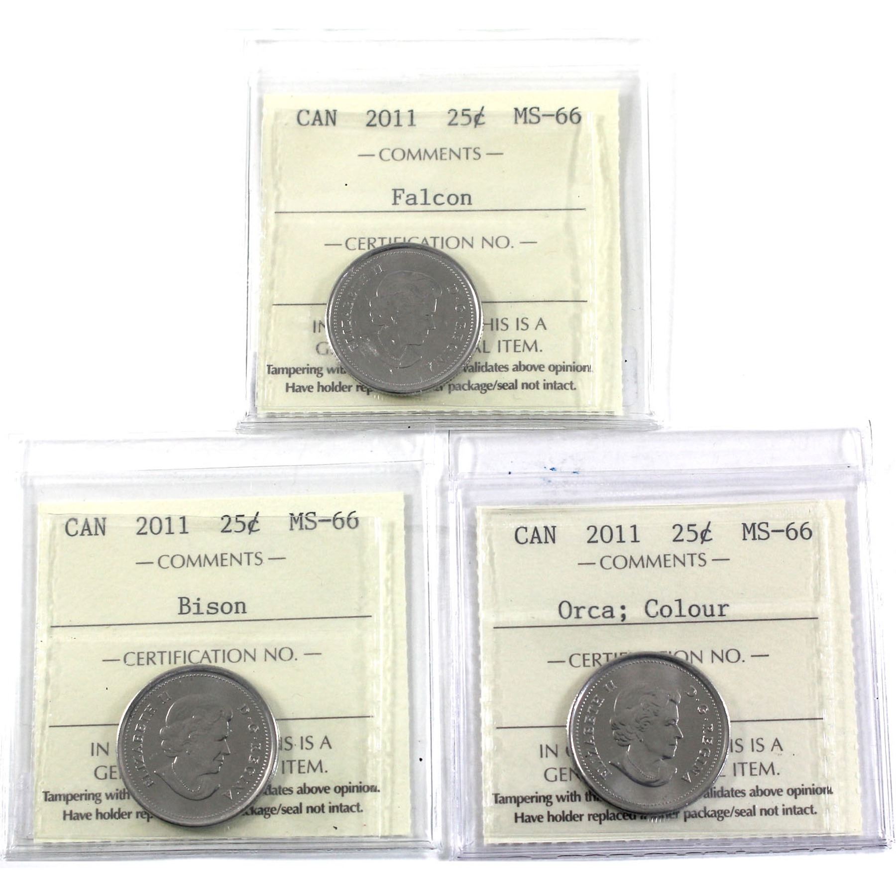 25-cent 2011 Falcon, Bison & Coloured Orca ICCS Certified MS-66. 3pcs