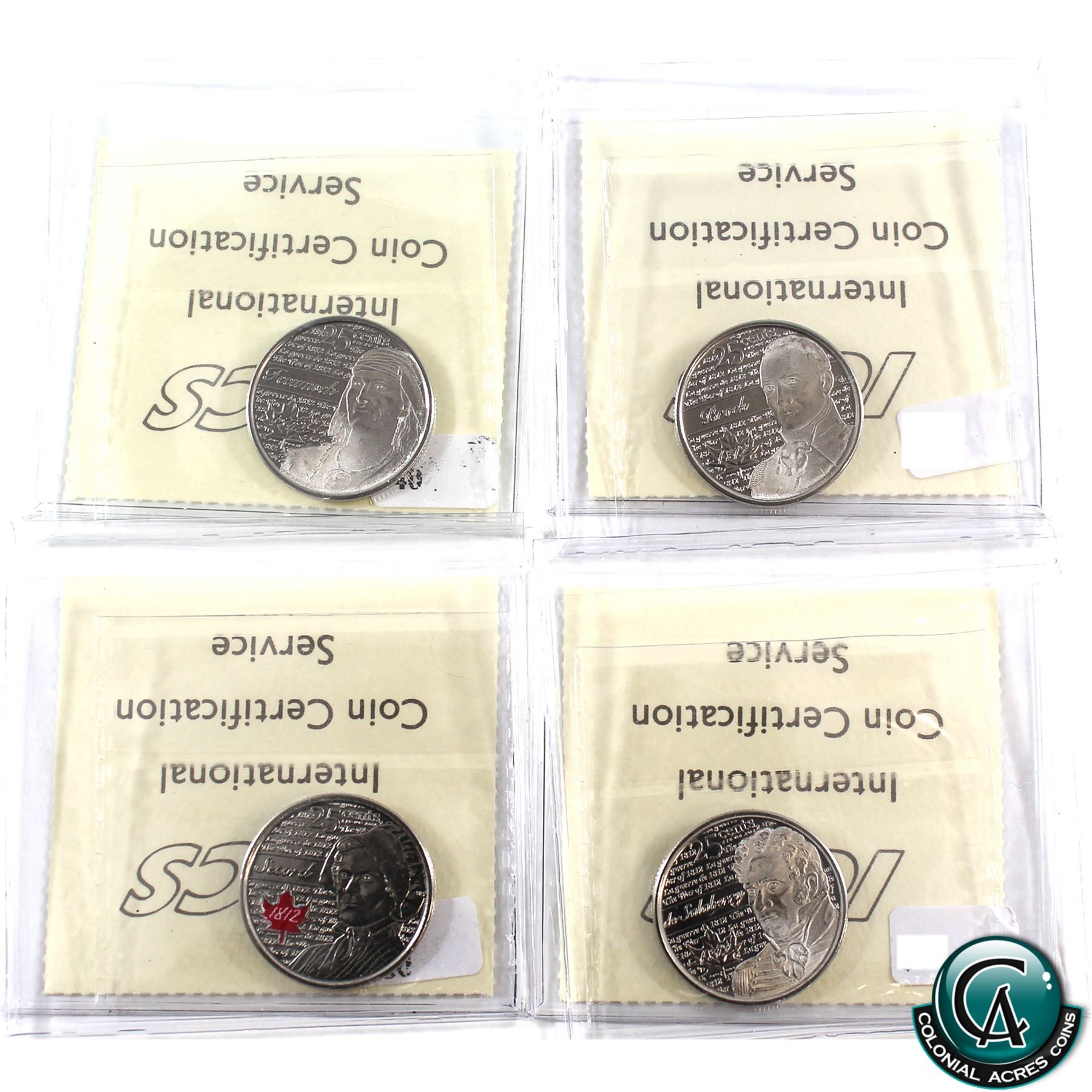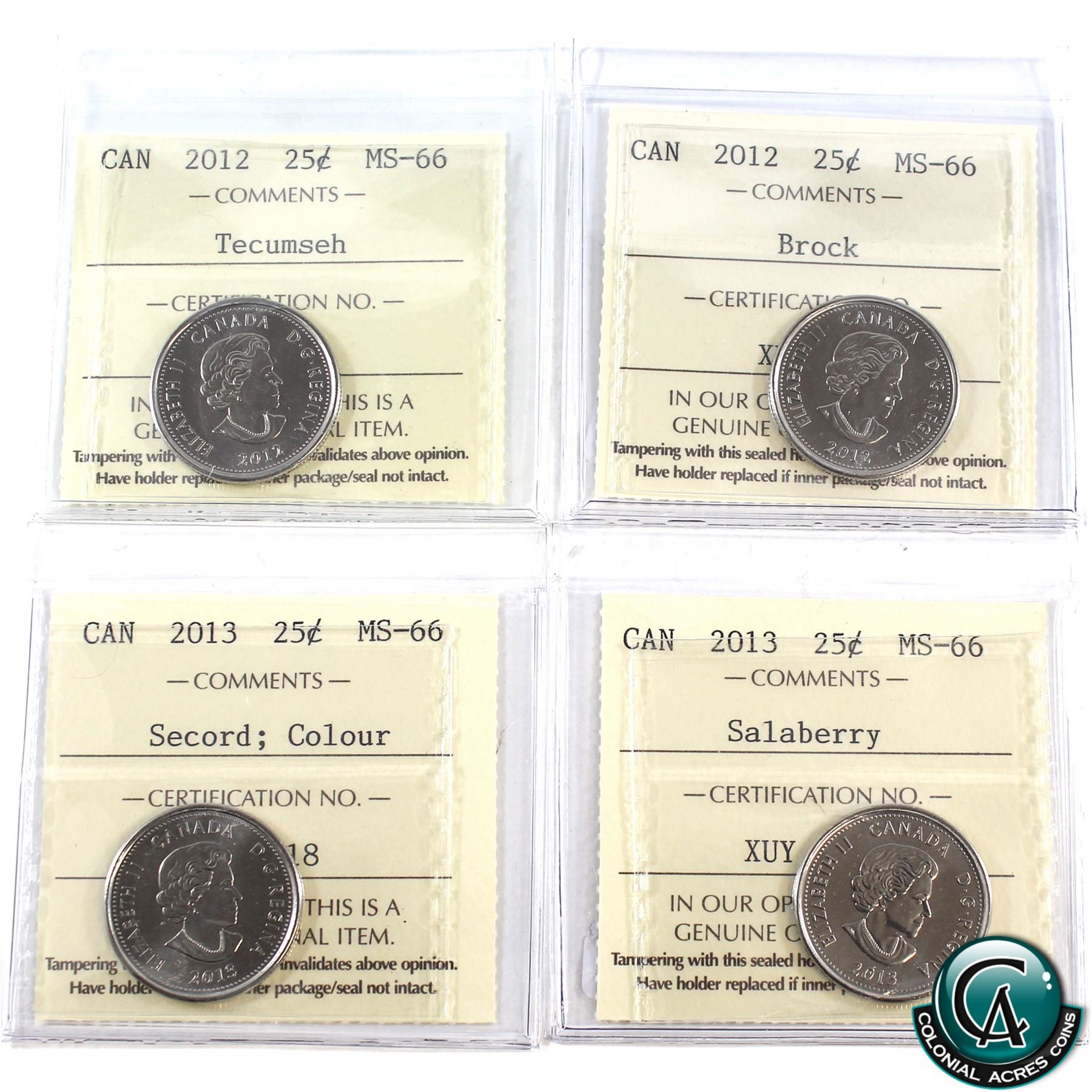 25-cent 2012 Tecumseh, 2012 Brock, 2013 Coloured Secord, 2013 Salaberry ICCS Certified MS-66. 4pcs.