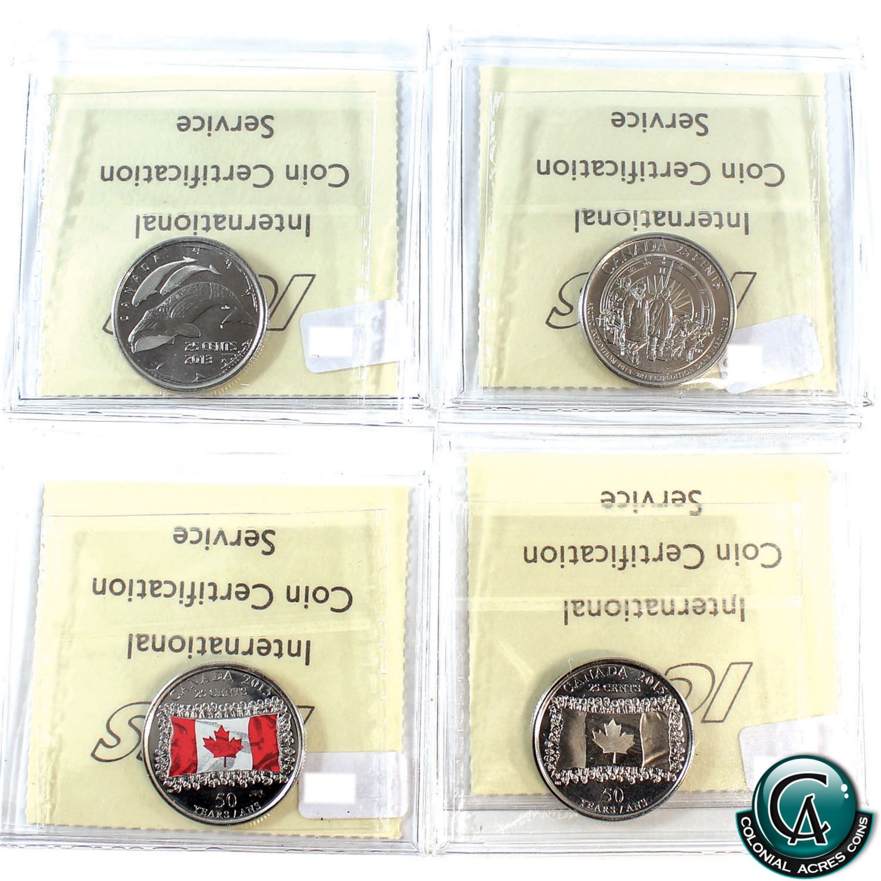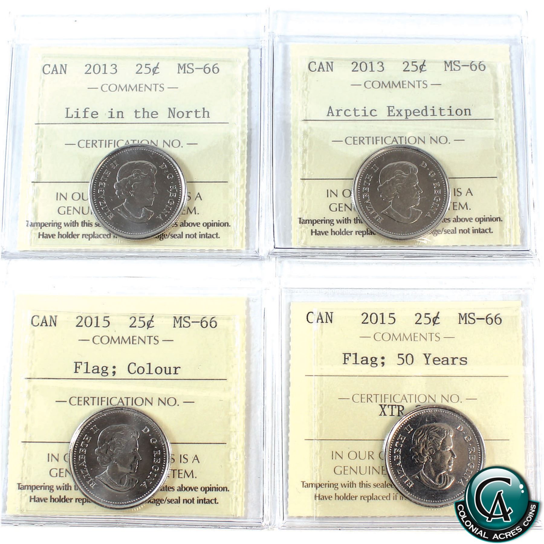 25-cent 2013 Life in the North, 2013 Arctic Expedition, 2015 Coloured Flag, 2015 Flag ICCS Certified MS-66. 4pcs.