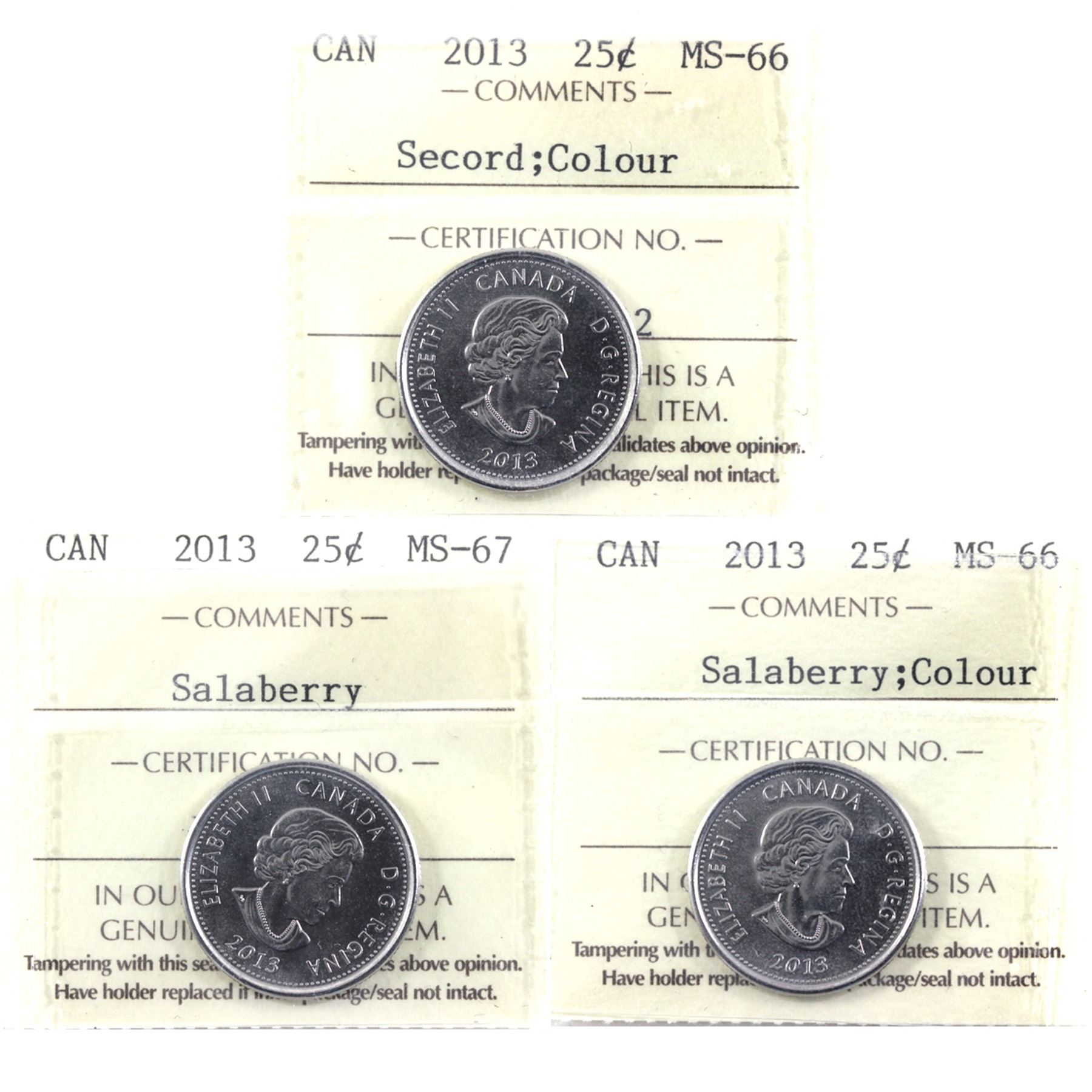 25-cent 2013 Secord Coloured, 2013 Salaberry & 2013 Salaberry Colour all ICCS Certified MS-66/67.  3pcs