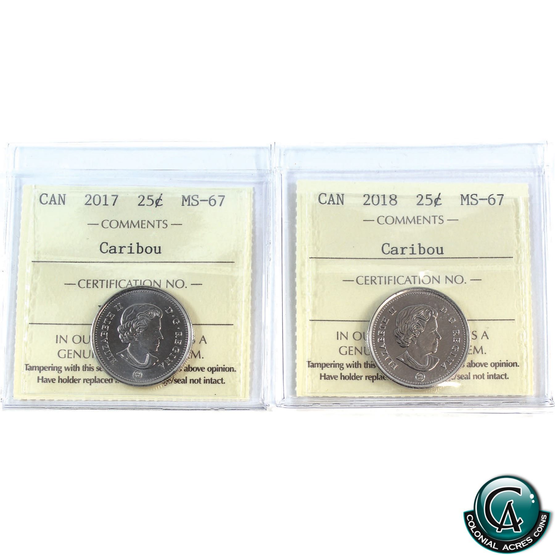 25-cent 2017 Caribou & 2018 Caribou ICCS Certified MS-67. 2pcs.