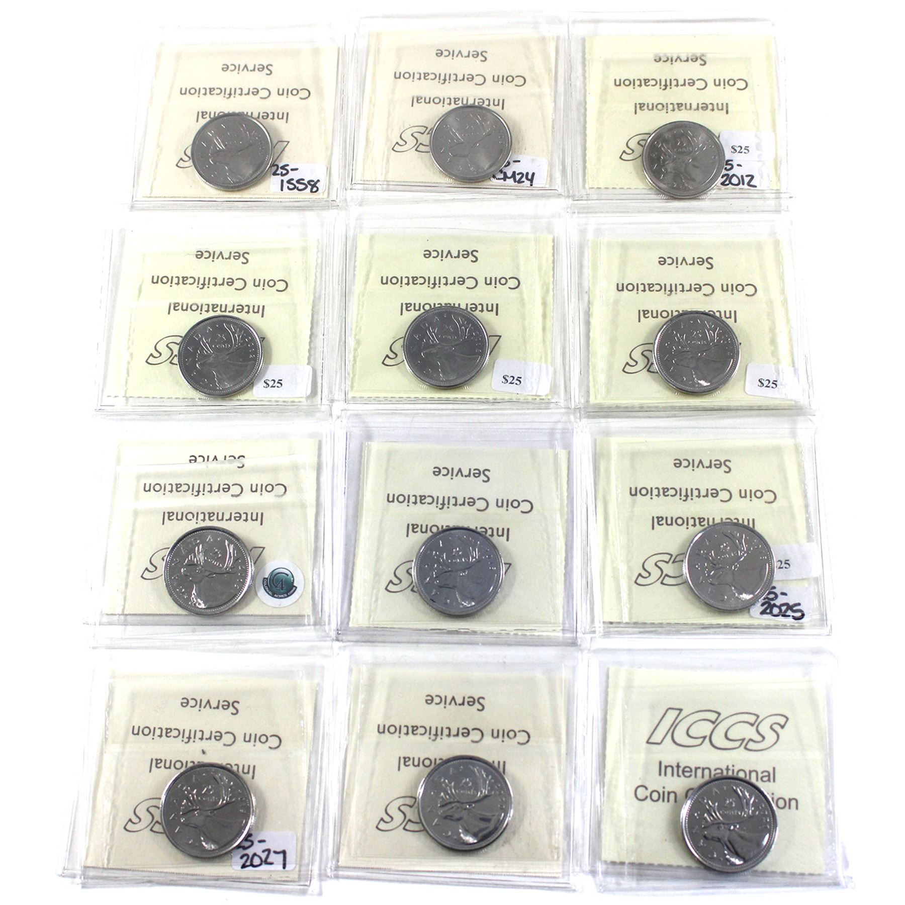 25-cent Caribou 2008, 2009, 2010, 2012, 2013, 2014, 2015, 2016, 2018, 2019, 2020, & 2021 ICCS MS65. 10pcs.