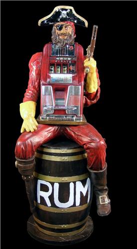25 cent "Mills" hi-top slot machine in a Pirate on a barrel, originally made by John Caler<BR><b>Due to laws regulating the sale of antique slot machines, I, as the seller, will not sell to members in the states of Alabama, Connecticut, Hawaii, Indiana, Nebraska, South Carolina, and Tennessee. Bids from members residing in any of these states will be cancelled.</b>