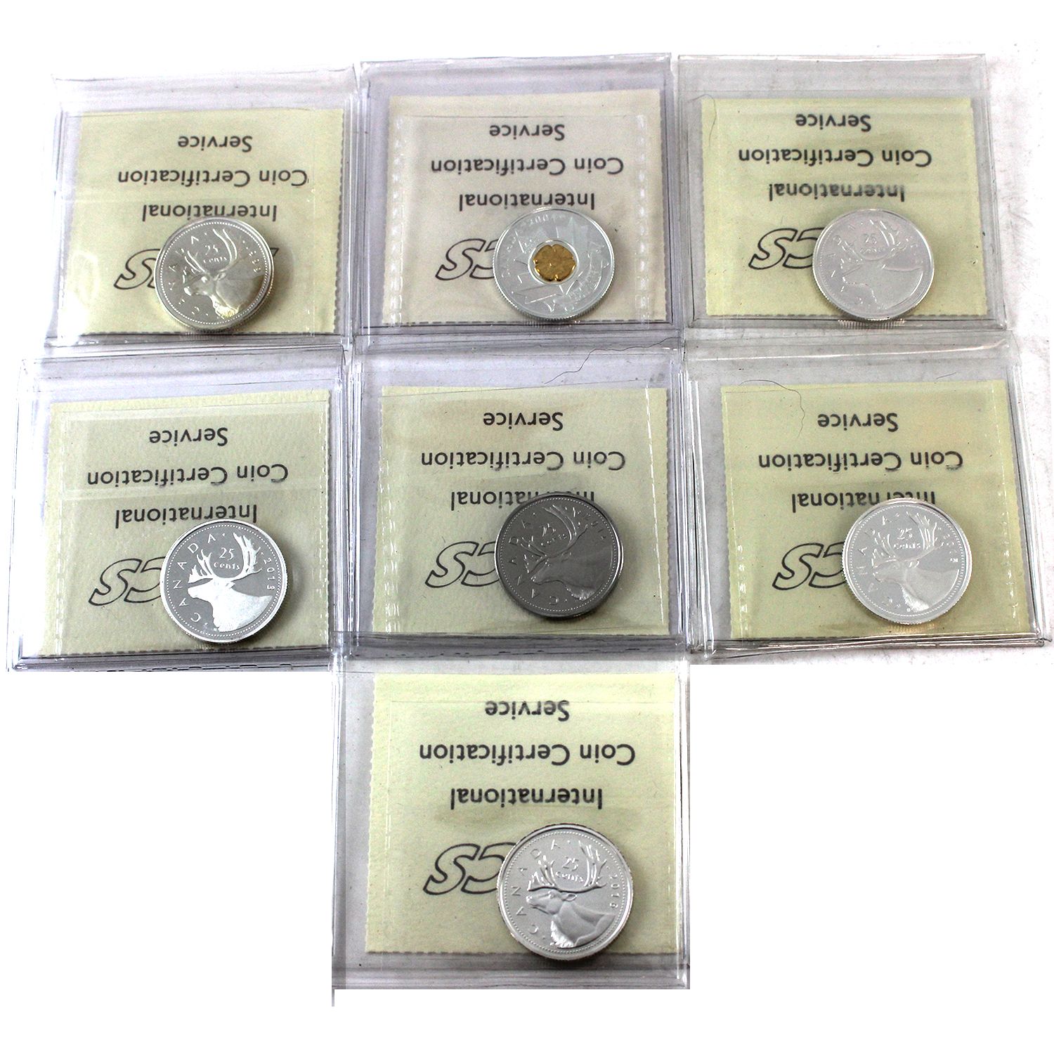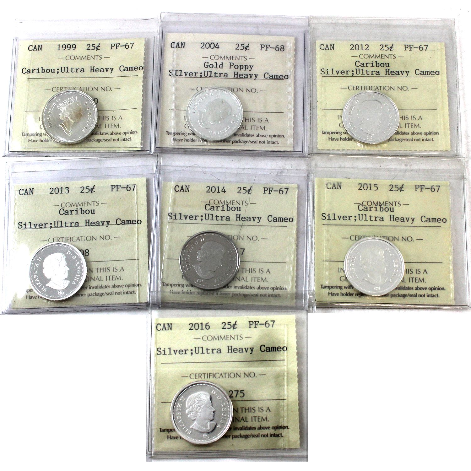 25-cent Silver 1999, 2004 Gold Poppy & 2012-2016 ICCS PF67/PF68 Ultra Heavy Cameo. All coins PF67 except 2004 is PF68. Note the 1999 holder does not contain the word 'silver' on it. 7pcs