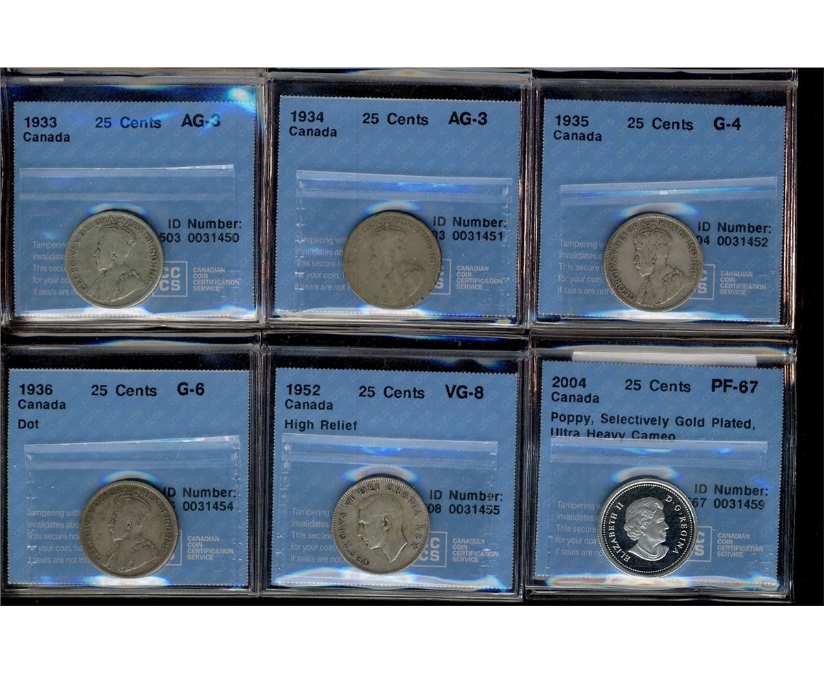 25 cents 1933 CCCS AG-3, 1934 CCCS AG-3, 1935 CCCS G-4, 1936 CCCS G-6; Dot, 1952 CCCS VG-8; High Relief & 2004 CCCS PF-67; Poppy Selectively Gold Plated Ultra Heavy Cameo. Lot of 6 coins.
