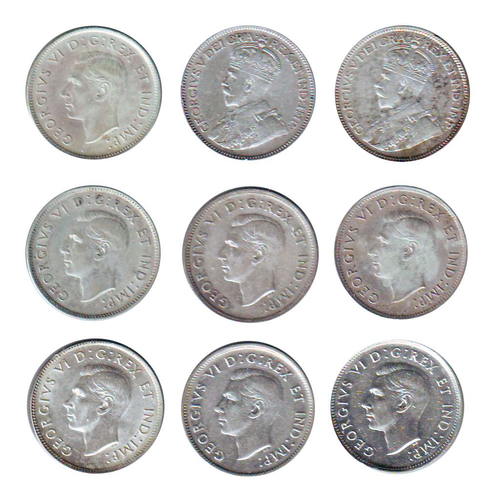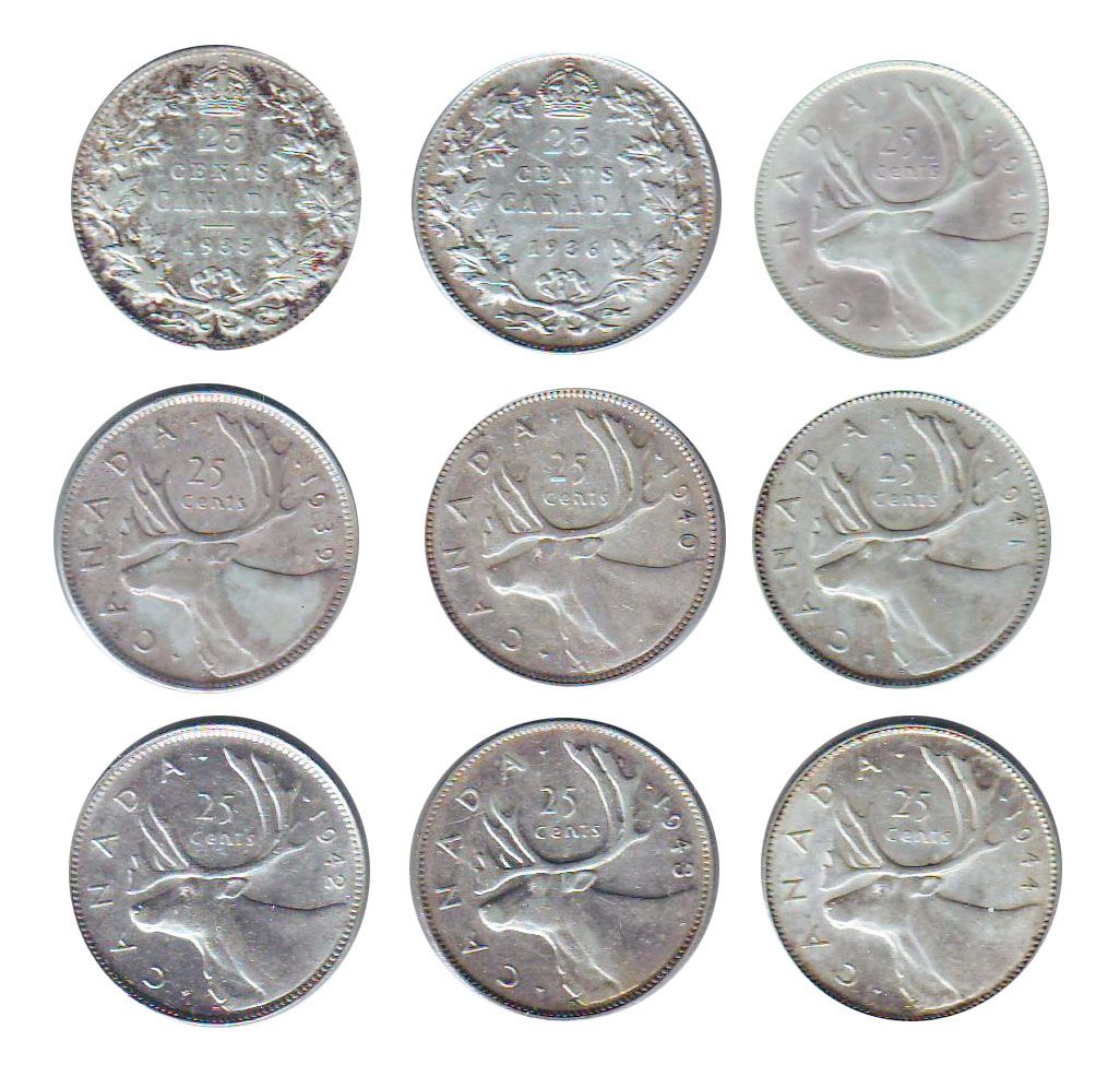 25 cents 1935 VF-20, 1936 VF-20, 1938 VF-20, 1939 VF-20, 1940 VF-20, 1941 VF-20, 1942 EF-40, 1943 VF-20 & 1944 EF-40, Lots of 9 coins.
