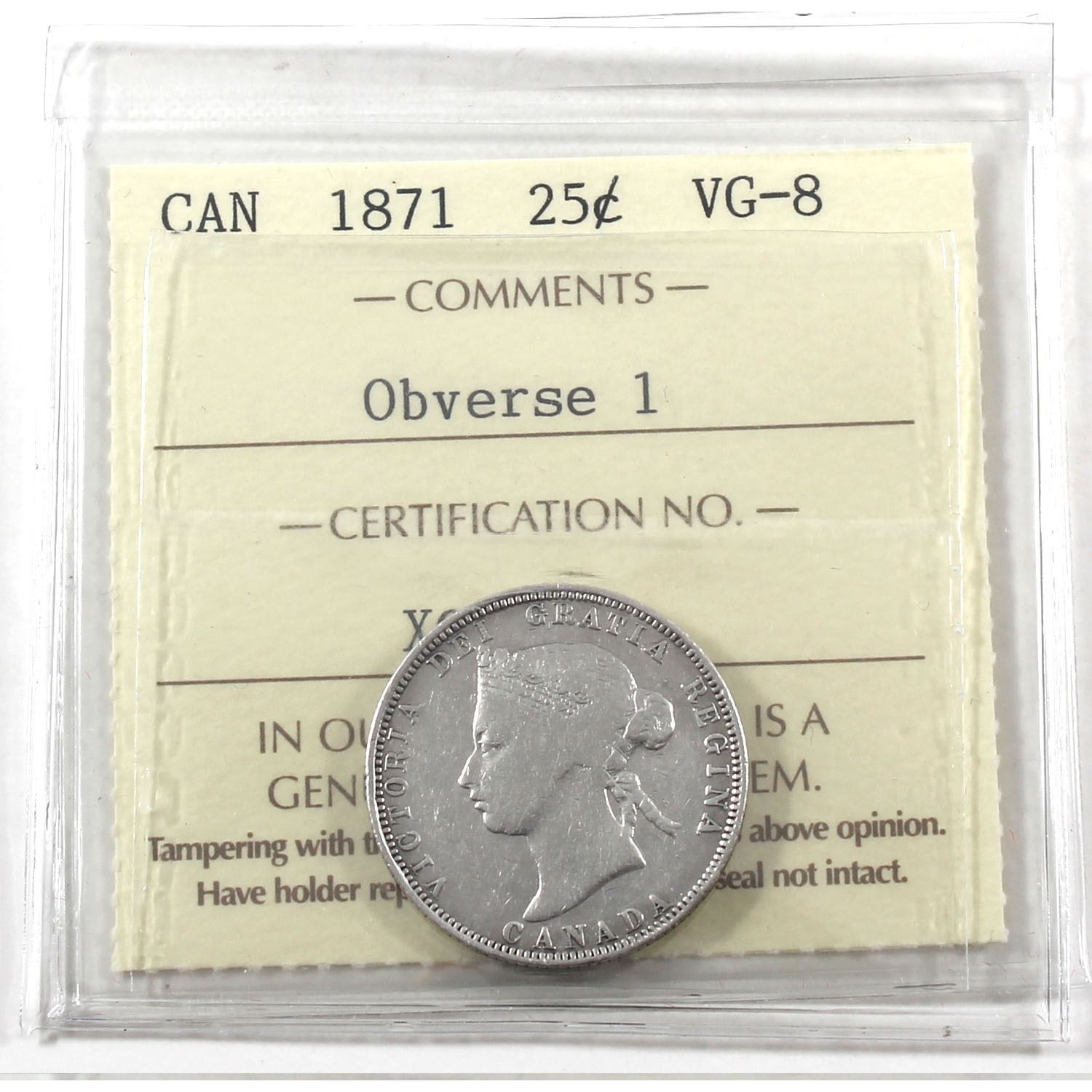 25-cents Canada 1871 Obv. 1 ICCS Certified VG-8 *Key Date*