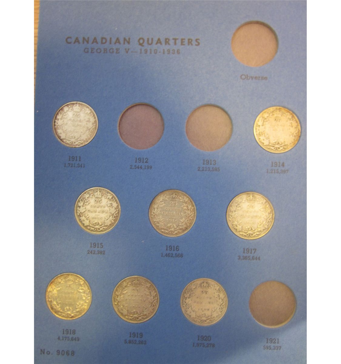 25 cents lot; 1911 VG, 1914 G, 1915 VG, 1916 VF, 1917 F, 1918 VF-30, 1919 F, 1920 VG, 1928 F, 1929 VG+, 1931 VF Cleaned, 1935 VF, 1936 VF, 1936 Dot VG, 1937 to 1952 inclusively low grade (silver), in a Whitman album to be viewed. Lot of 31 coins.