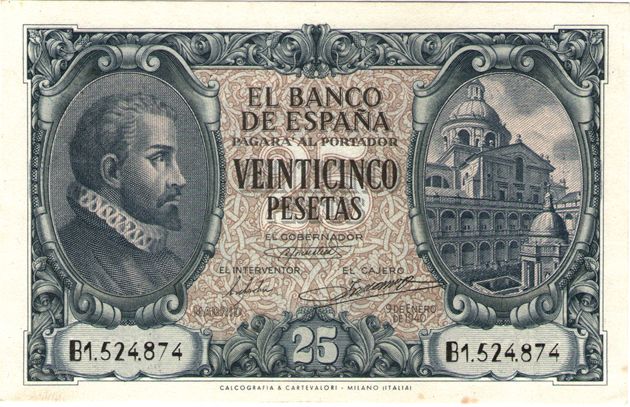25 pesetas. 1-1940. Serie B. ED-D37a. Mínima arruga en el vértice inferior derecho. Plancha.