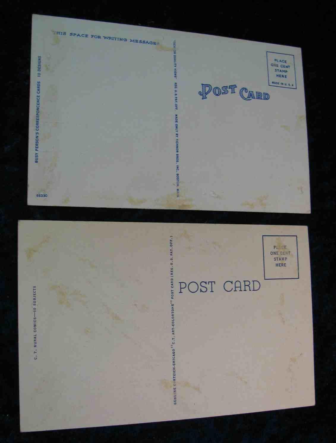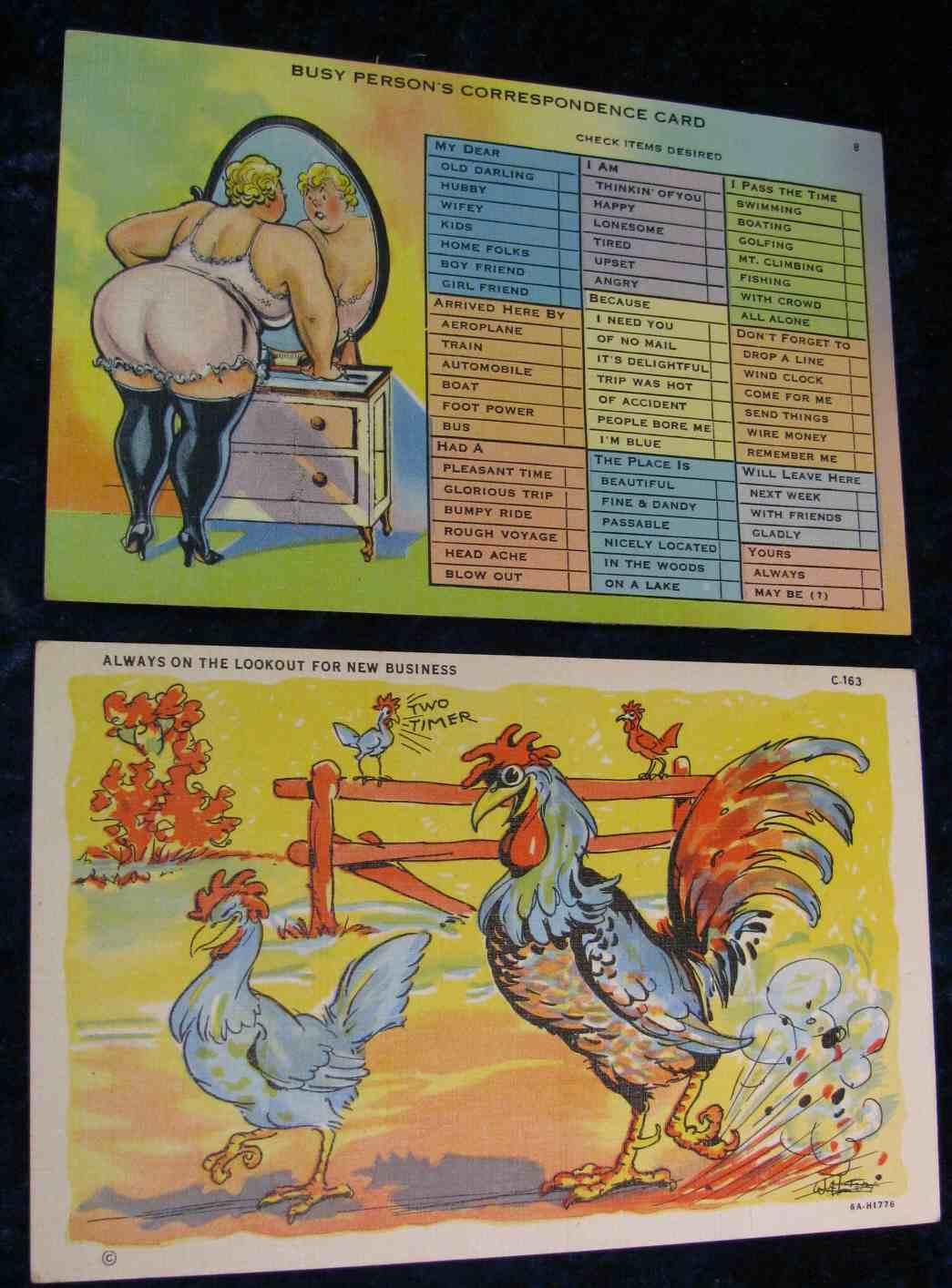 250. (2) WW II Era Risqué Post Cards. One depicts large woman with bare bottom, other has a rooster and hen, "Always on the lookout for new business". Unissued.