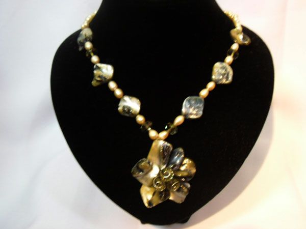 250 CTW MOTHER OF PEARL FLOWER PENDANT BLACK AND PEACH **|**|** 250 CTW MOTHER OF PEARL FLOWER PENDANT BLACK AND PEACH PEARL WITH CRYSTALS NECKLACE; 18 INCHES; PHILIPPINE PEARLS ; MSRP: $500