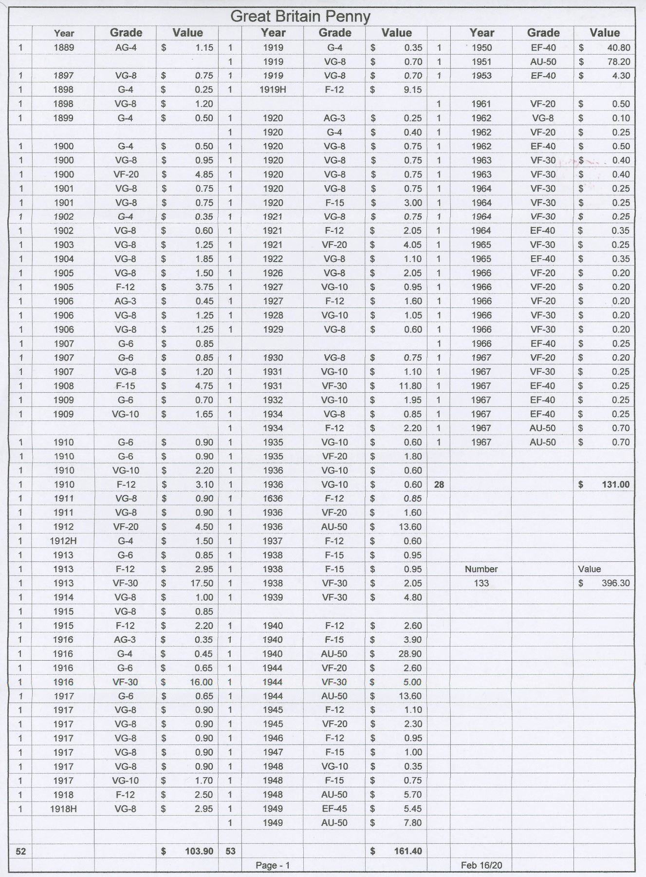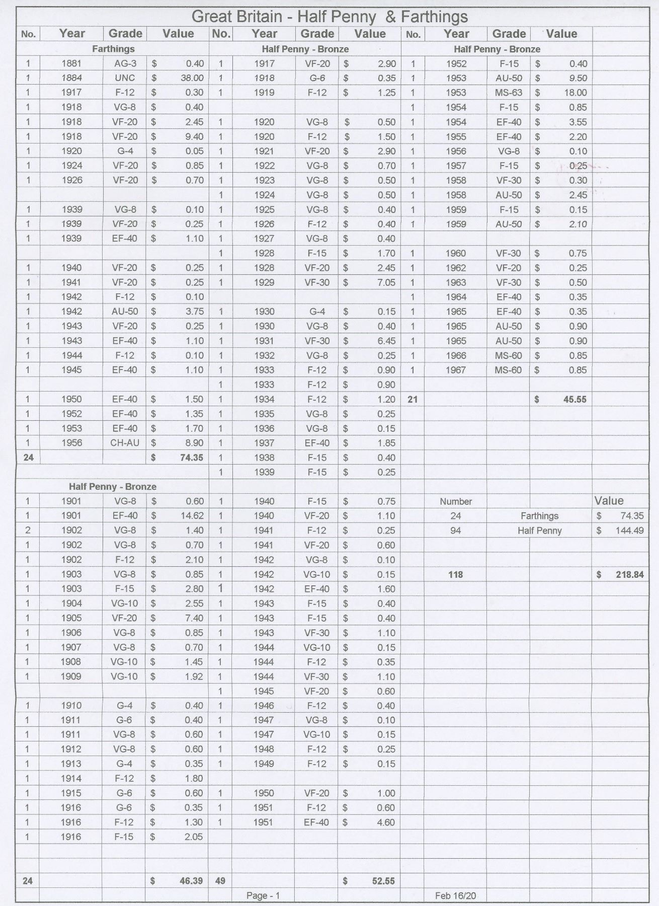 250 - Great Britain - Farthings, Pennies & Half Pennies (Trends Value $615.14)