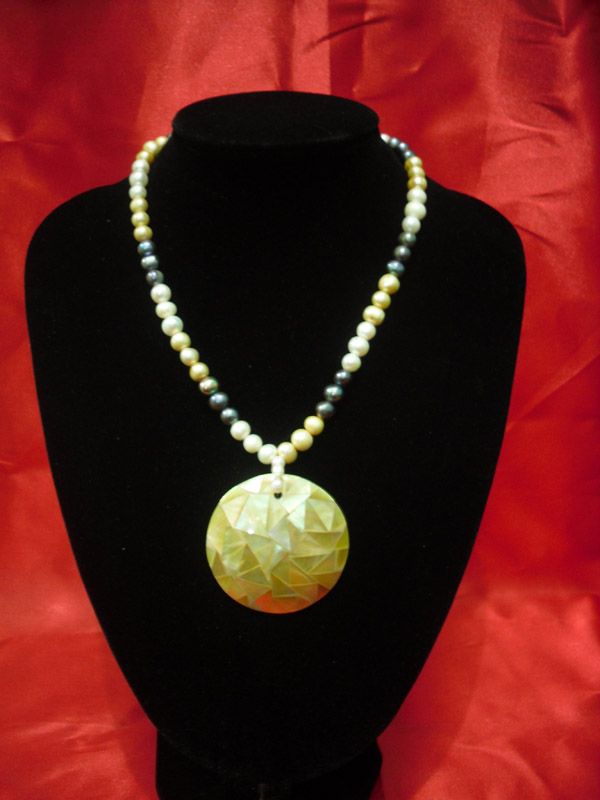 250CTW FRESHWATER TRICOLOR (YELLOW WHITE & BLACK) PEA **|**|** 250CTW FRESHWATER TRICOLOR (YELLOW WHITE & BLACK) PEARL WITH CAPIZ NECKLACE ; MSRP: $250