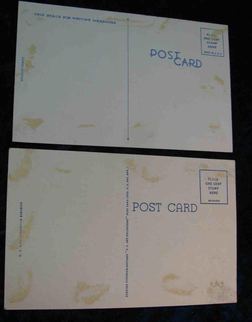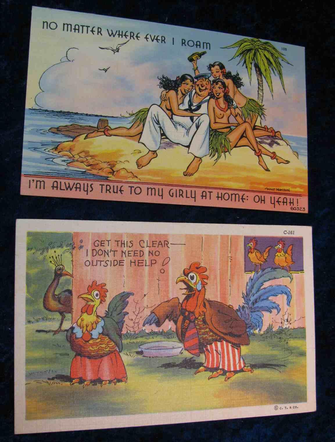 251. (2) WW II Era Risqué Post Cards. One depicts man with three babes on desert island, "no matter where ever I roam I'm always true to my girly at home: Oh Yeah!", other with rooster and hen "Get this clear, I don't need no outside help!".