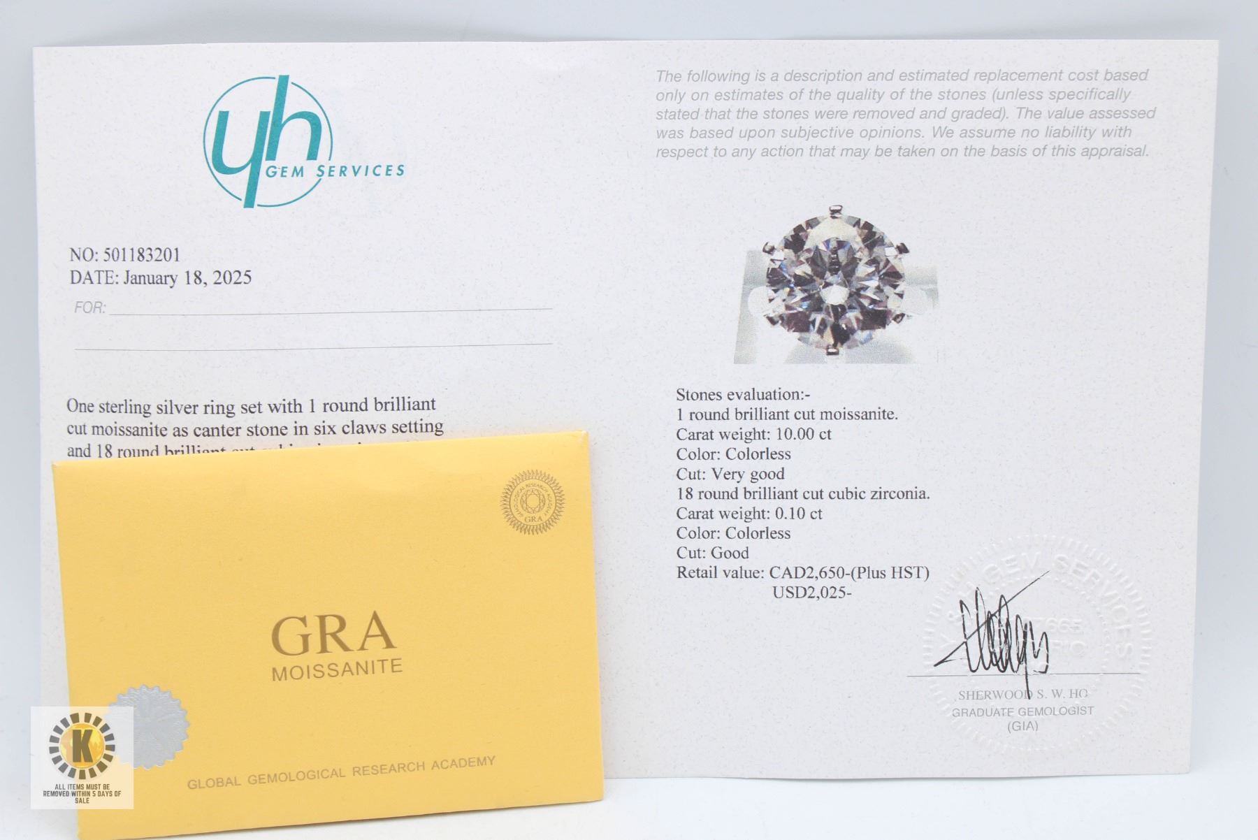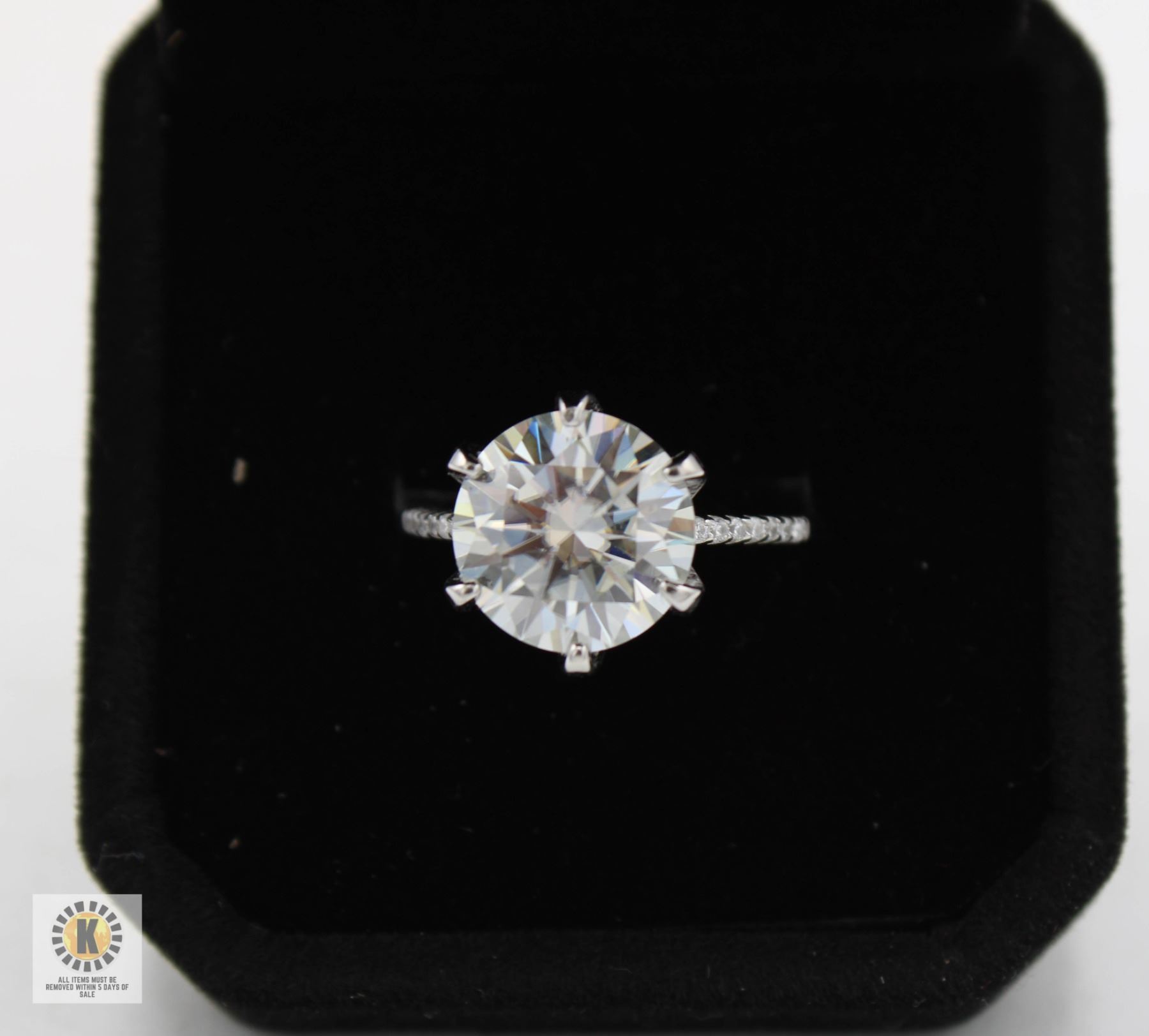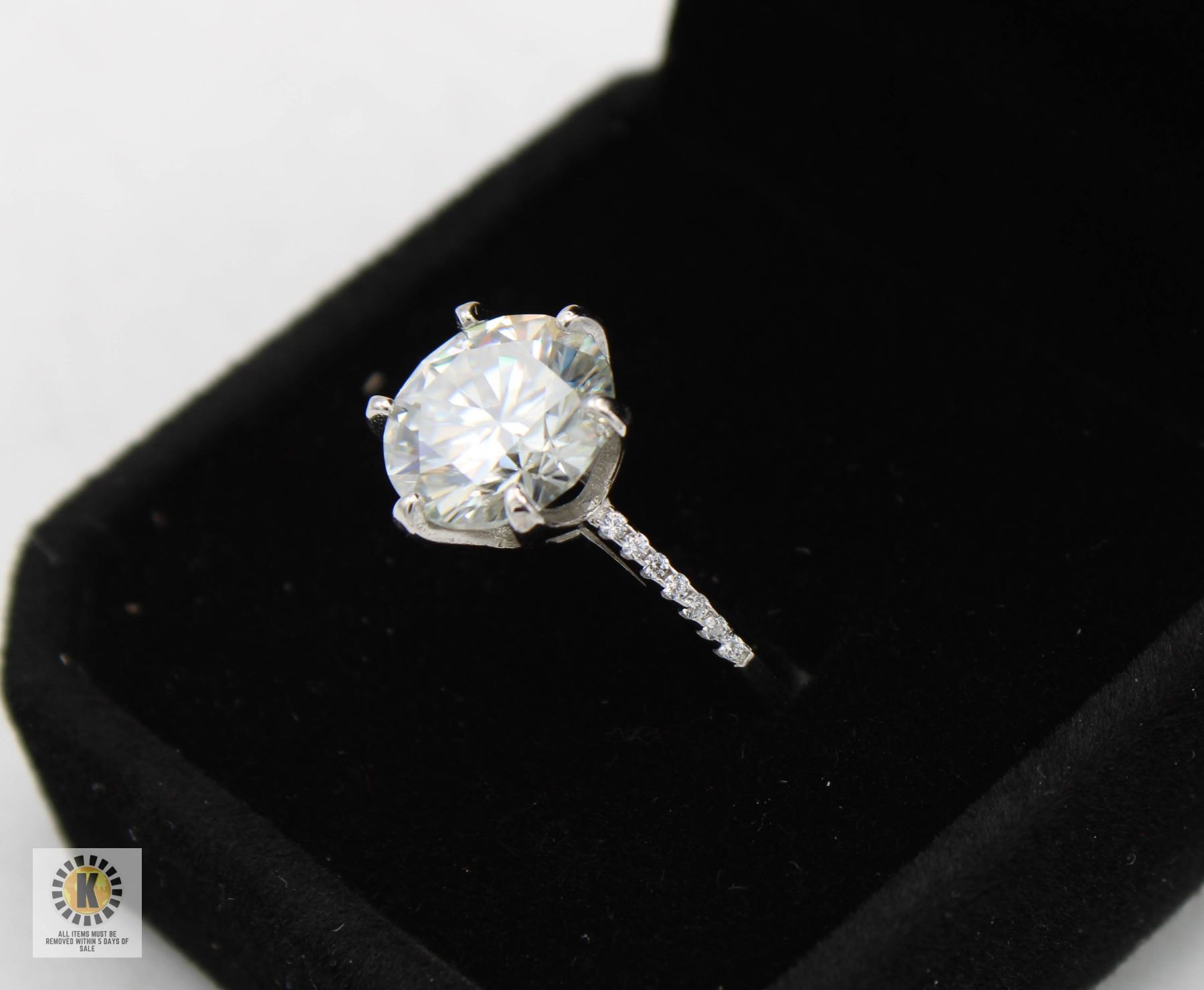 MOISSANITE STONE VVS D COLOR SET IN CENTER WITH 14 ROUND BRILLIANT CUT CUBIC ZIRCONIA AND SET IN 925 SILVER RING SIZE 7 RETAIL VALUE $1,450.00 **ALL ITEMS MUST BE REMOVED BY 5PM SATURDAY, APRIL 3RD 2025. ALL REMAINING ITEMS WILL BE SUBJECT TO A $6.00 PER DAY STORAGE CHARGE. ANY ITEMS REMAINING AFTER MONDAY, MAY 19TH 2025 WILL BE CONSIDERED FORFEITED. NO REFUNDS WILL BE ISSUED FOR FORFEITED ITEMS. TO SCHEDULE A PICK UP APPOINTMENT CLICK HERE