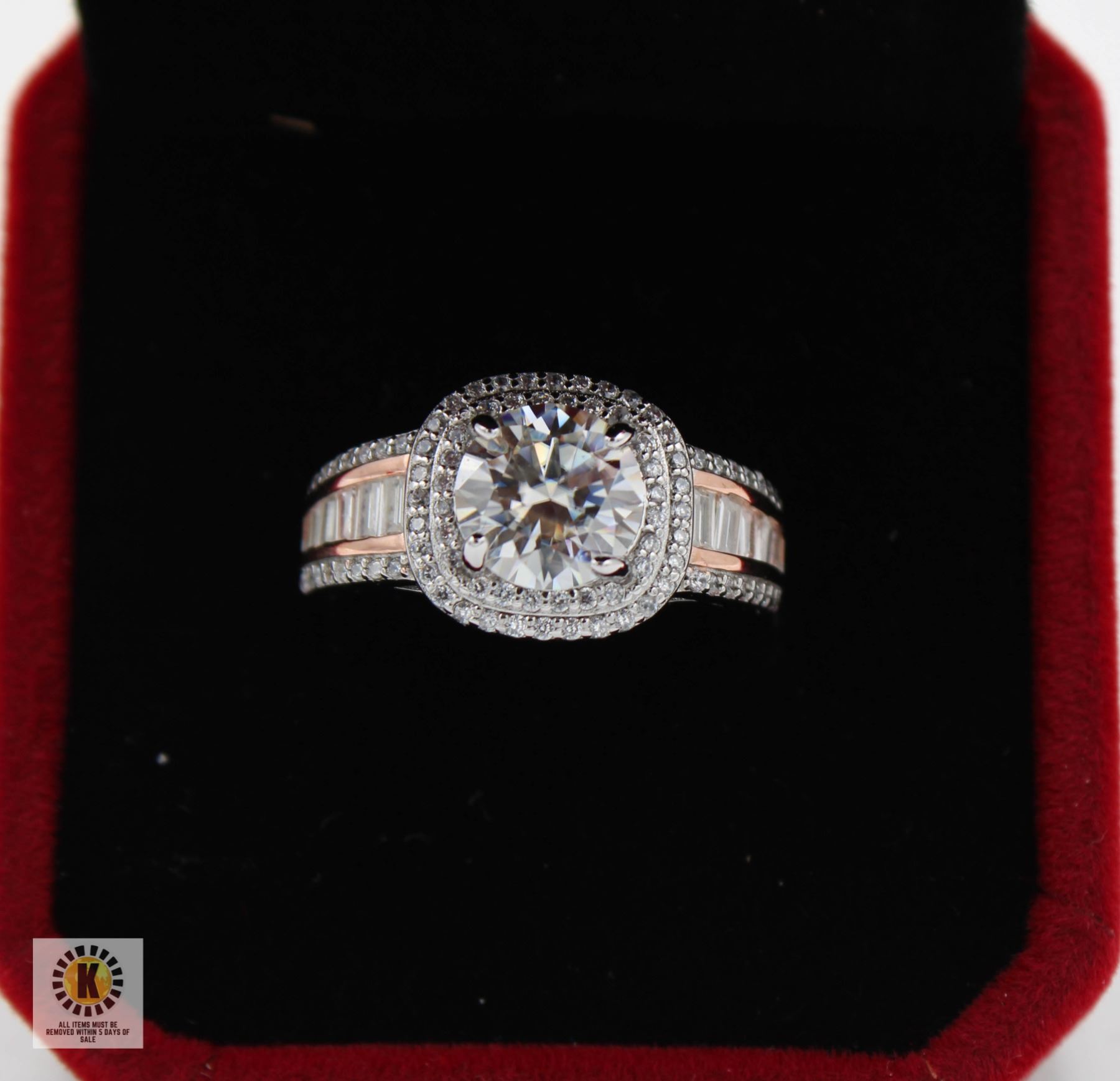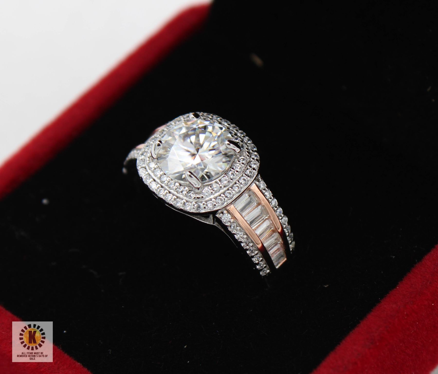 MOISSANITE STONE VVS D COLOR WITH 12 BAGUETTE CUBIC ZIRCONIA AND 88 ROUND BRILLIANT CUT CUBIC ZIRCONIA SET IN DUAL HALO AND MORE IN THE SHANK SET IN 925 SILVER RING SIZE 8 RETAIL VALUE $975.00 **ALL ITEMS MUST BE REMOVED BY 5PM SATURDAY, APRIL 3RD 2025. ALL REMAINING ITEMS WILL BE SUBJECT TO A $6.00 PER DAY STORAGE CHARGE. ANY ITEMS REMAINING AFTER MONDAY, MAY 19TH 2025 WILL BE CONSIDERED FORFEITED. NO REFUNDS WILL BE ISSUED FOR FORFEITED ITEMS. TO SCHEDULE A PICK UP APPOINTMENT CLICK HERE