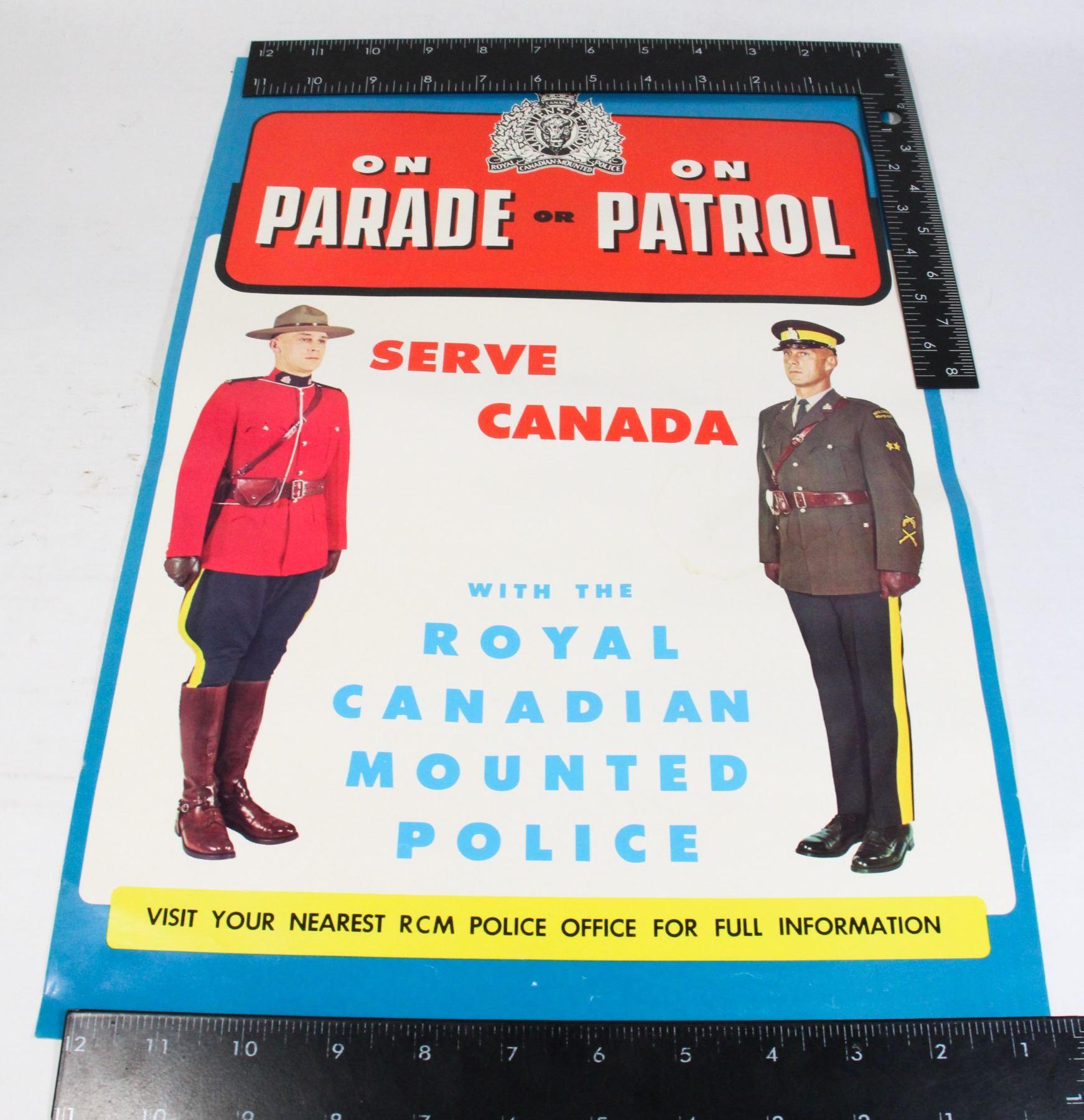 18 INCHES TALL BY12 INCHES LONG, 1960'S 1970'S RCMP RECRUITMENT POSTER ROYAL CANADIAN MOUNTED POLICE. "ON PARADE OR ON PATROL". HAS SOME DISCOLORATION IN CENTER AND WEAR- WOULD LOOK EXCELLENT FRAMED. ROLLED POSTER.