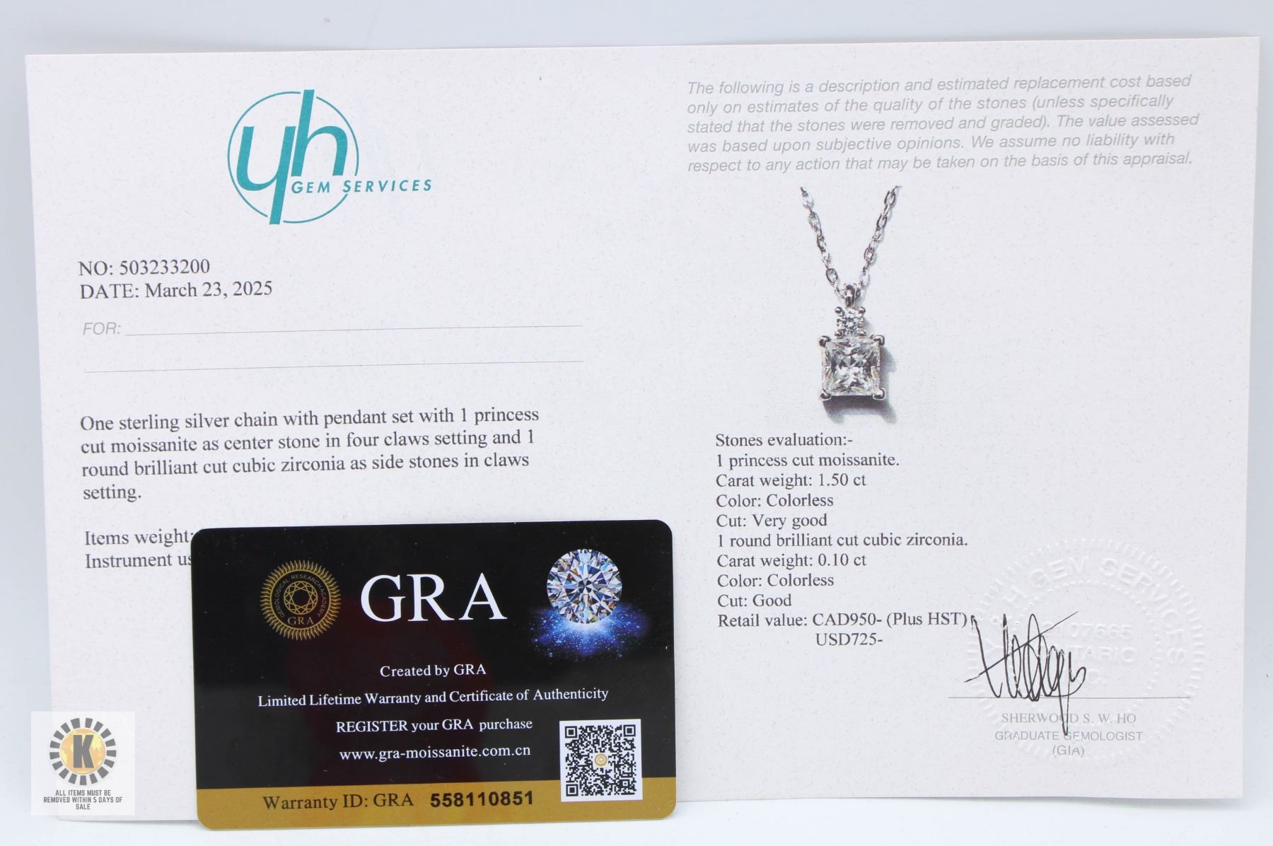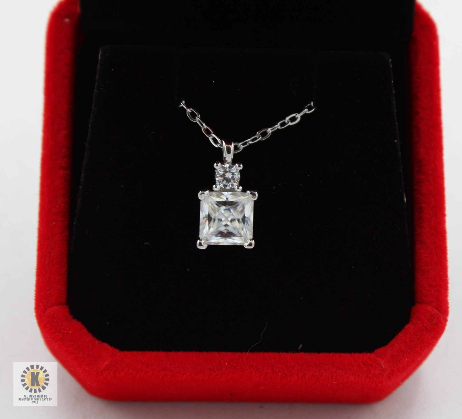 MOISSANITE STONE VVS D COLOR WITH 1 ROUND BRILLIANT CUT CUBIC ZIRCONIA SET ABOVE THE PRINCESS CUT SET IN NECKLACE SET IN 925 SILVER RETAIL VALUE $950.00 **ALL ITEMS MUST BE REMOVED BY 5PM SATURDAY, APRIL 3RD 2025. ALL REMAINING ITEMS WILL BE SUBJECT TO A $6.00 PER DAY STORAGE CHARGE. ANY ITEMS REMAINING AFTER MONDAY, MAY 19TH 2025 WILL BE CONSIDERED FORFEITED. NO REFUNDS WILL BE ISSUED FOR FORFEITED ITEMS. TO SCHEDULE A PICK UP APPOINTMENT CLICK HERE
