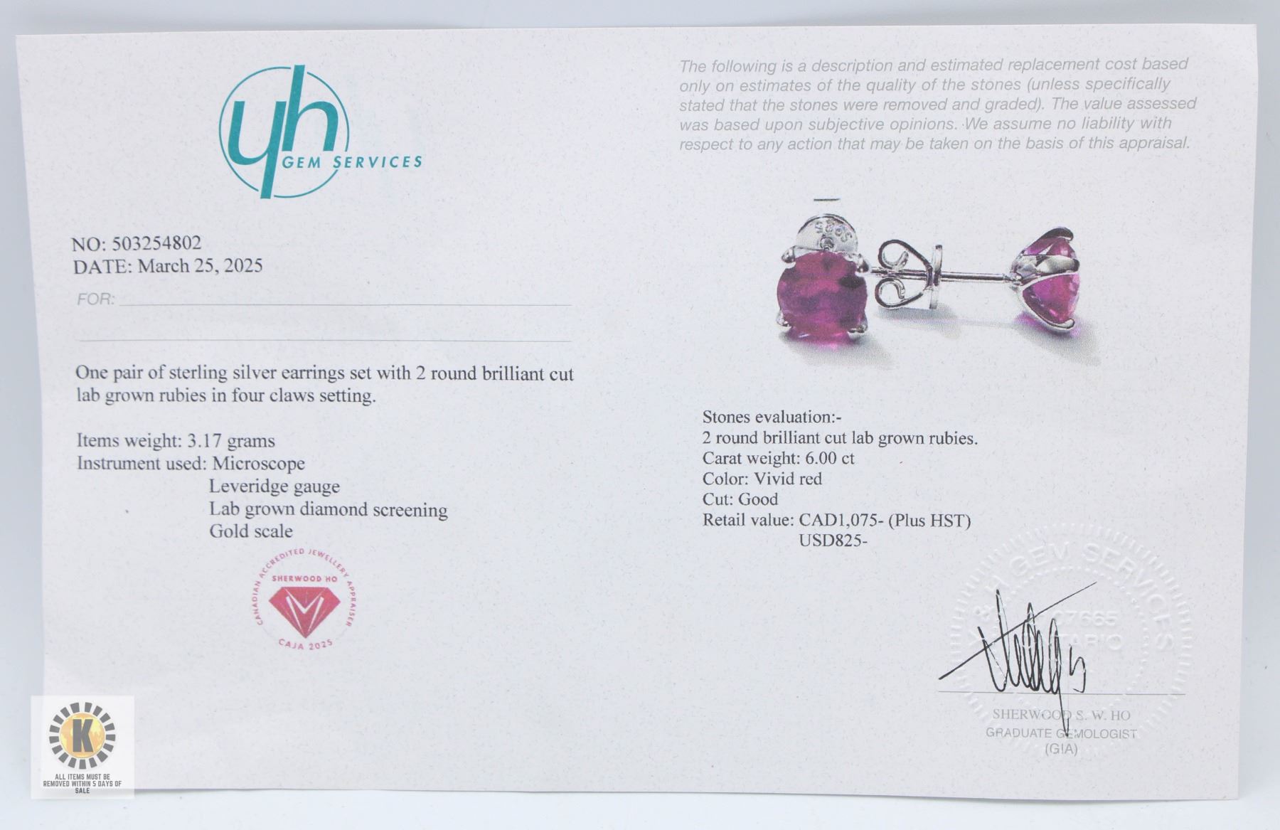 RUBY STONES VIVID RED COLOR SET IN 4 CLAW BASKET HEAD SET IN 925 SILVER EARRINGS RETAIL VALUE $1,075.00 **ALL ITEMS MUST BE REMOVED BY 5PM SATURDAY, APRIL 3RD 2025. ALL REMAINING ITEMS WILL BE SUBJECT TO A $6.00 PER DAY STORAGE CHARGE. ANY ITEMS REMAINING AFTER MONDAY, MAY 19TH 2025 WILL BE CONSIDERED FORFEITED. NO REFUNDS WILL BE ISSUED FOR FORFEITED ITEMS. TO SCHEDULE A PICK UP APPOINTMENT CLICK HERE