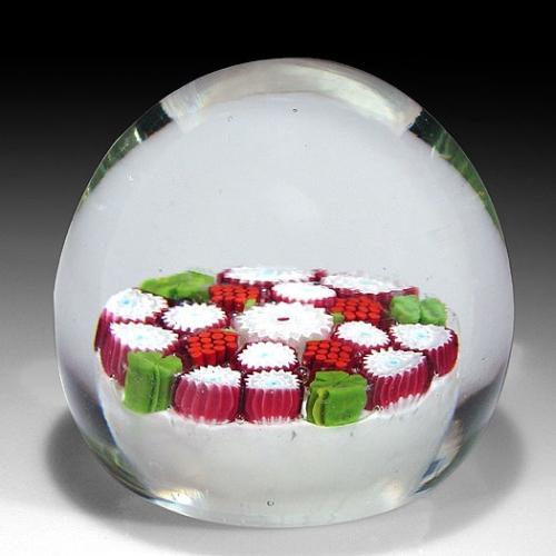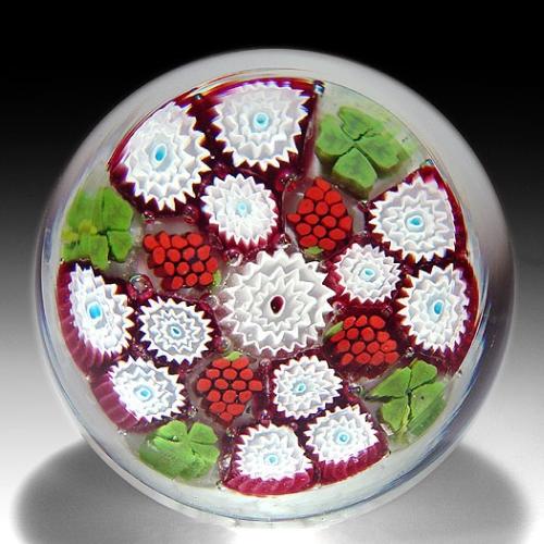 Murano Italian concentric millefiori paperweight, with raspberry and four-leaf clover canes. The piece contains a large, central, white, complex, cog cane, which is surrounded by four spaced red raspberry canes and four spaced green four-leaf clover canes, alternating with red and white cog canes, over white ground. Diameter 3 1/4". NO RESERVE
