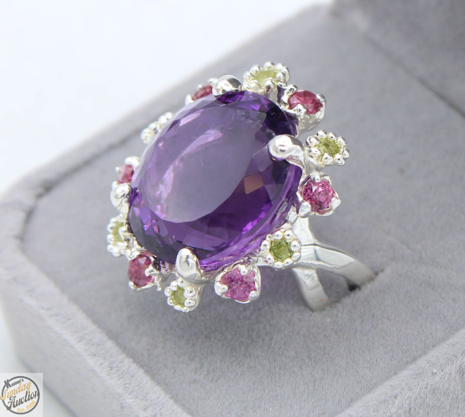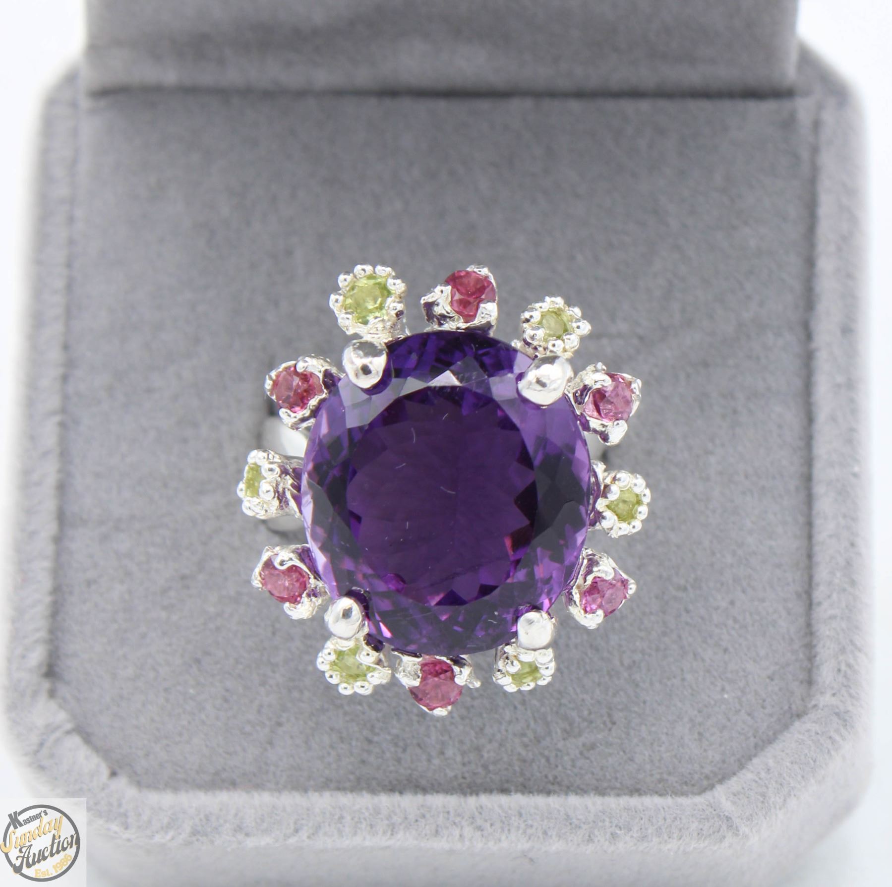 NATURAL AMETHYST WITH 12 ALTERNATING COLOR FROM LIGHT GREEN TO MEDIUM PURPLEÿ SMALL ROUND CUT STONES SET AROUND THE CENTER STONE SET INTO 925 SILVER RING SIZE 7.5 **ALL ITEMS MUST BE REMOVED BY 5PM SATURDAY, MAY 10TH 2025. ALL REMAINING ITEMS WILL BE SUBJECT TO A $6.00 PER DAY STORAGE CHARGE. ANY ITEMS REMAINING AFTER MONDAY, MAY 26TH 2025 WILL BE CONSIDERED FORFEITED. NO REFUNDS WILL BE ISSUED FOR FORFEITED ITEMS. TO SCHEDULE A PICK UP APPOINTMENT CLICK HERE