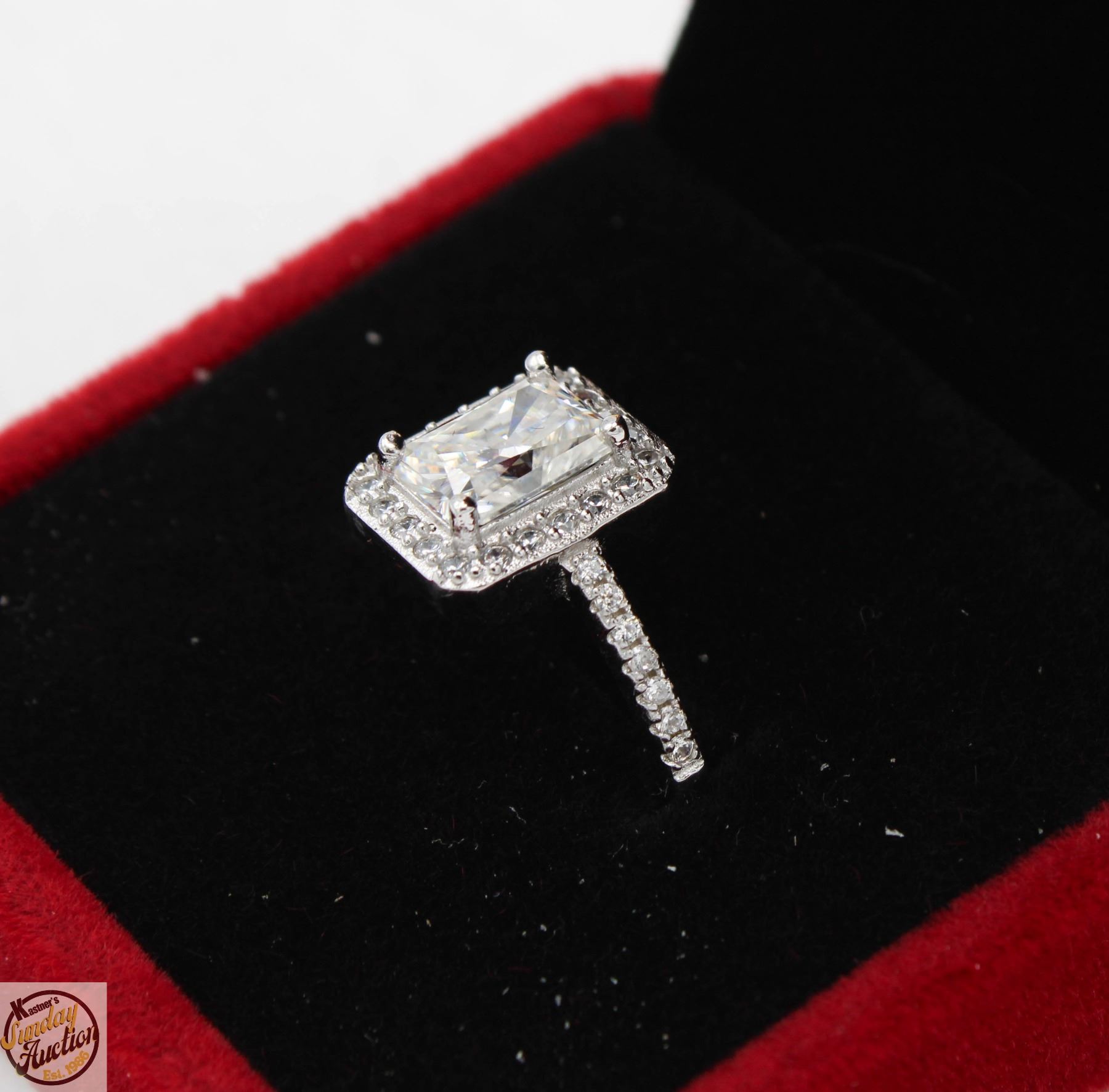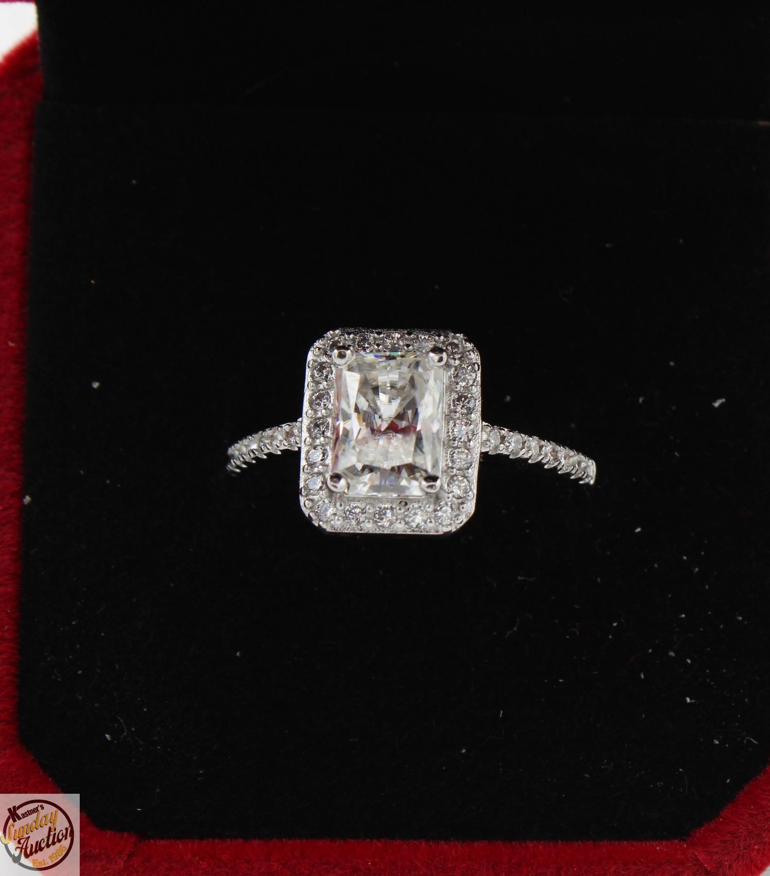 MOISSANITE STONE VVS D COLOR WITH 36 ROUND BRILLIANT CUT CUBIC ZIRCONIA SET AROUND RECTANGULAR HALO WITH MORE SET IN THE SHANK SET IN 925 SILVER RING SIZE 7 RETAIL VALUE $1,050.00 **ALL ITEMS MUST BE REMOVED BY 5PM SATURDAY, MAY 10TH 2025. ALL REMAINING ITEMS WILL BE SUBJECT TO A $6.00 PER DAY STORAGE CHARGE. ANY ITEMS REMAINING AFTER MONDAY, MAY 26TH 2025 WILL BE CONSIDERED FORFEITED. NO REFUNDS WILL BE ISSUED FOR FORFEITED ITEMS. TO SCHEDULE A PICK UP APPOINTMENT CLICK HERE