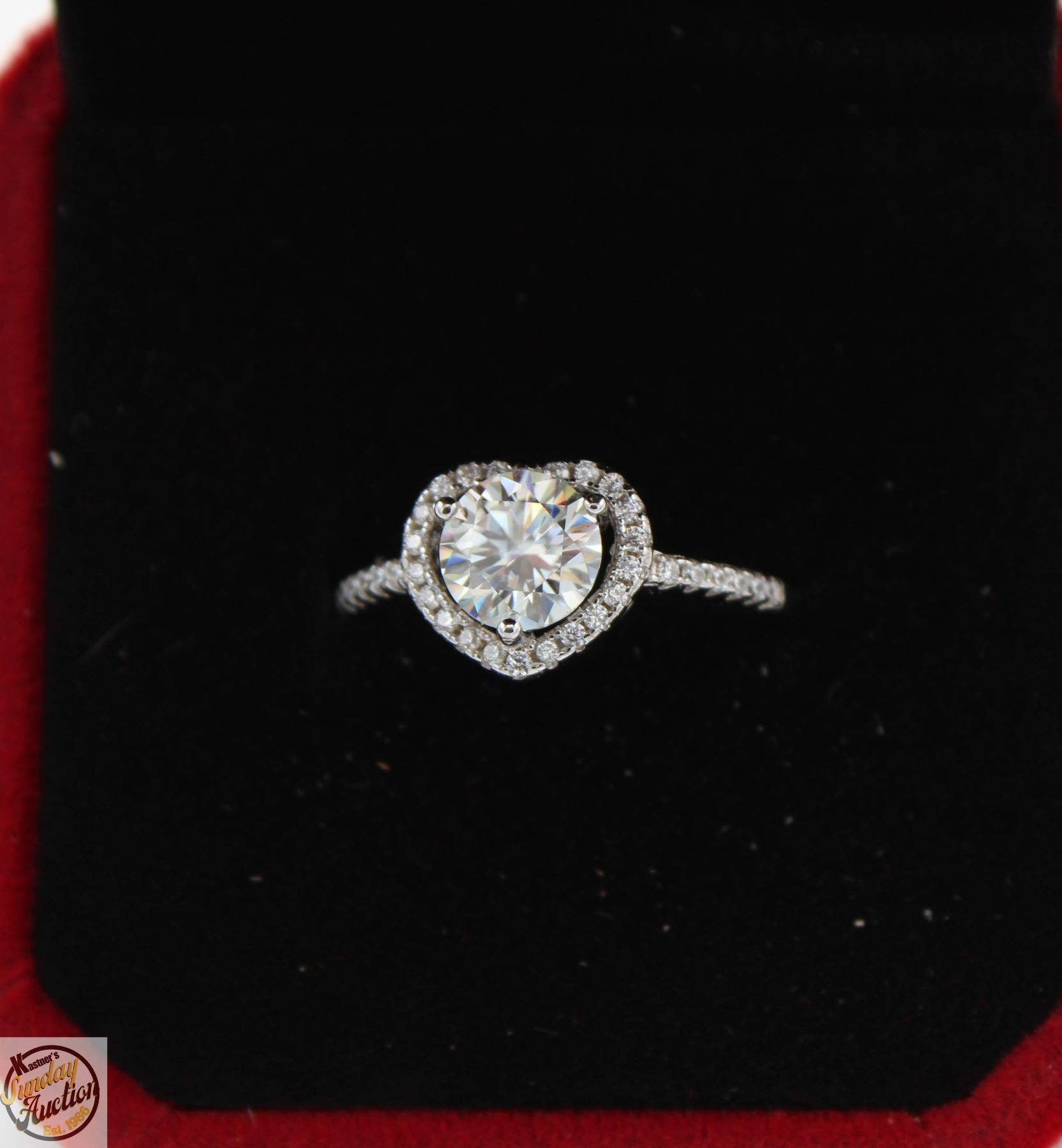CUT MOISSANITE STONE VVS D COLOR WITH 34 ROUND BRILLIANT CUT CUBIC ZIRCONIA SET IN HEART SHAPED HALO WITH MORE SET IN THE SHANK SET IN 925 SILVER RING SIZE 6 RETAIL VALUE $725.00 **ALL ITEMS MUST BE REMOVED BY 5PM SATURDAY, MAY 10TH 2025. ALL REMAINING ITEMS WILL BE SUBJECT TO A $6.00 PER DAY STORAGE CHARGE. ANY ITEMS REMAINING AFTER MONDAY, MAY 26TH 2025 WILL BE CONSIDERED FORFEITED. NO REFUNDS WILL BE ISSUED FOR FORFEITED ITEMS. TO SCHEDULE A PICK UP APPOINTMENT CLICK HERE
