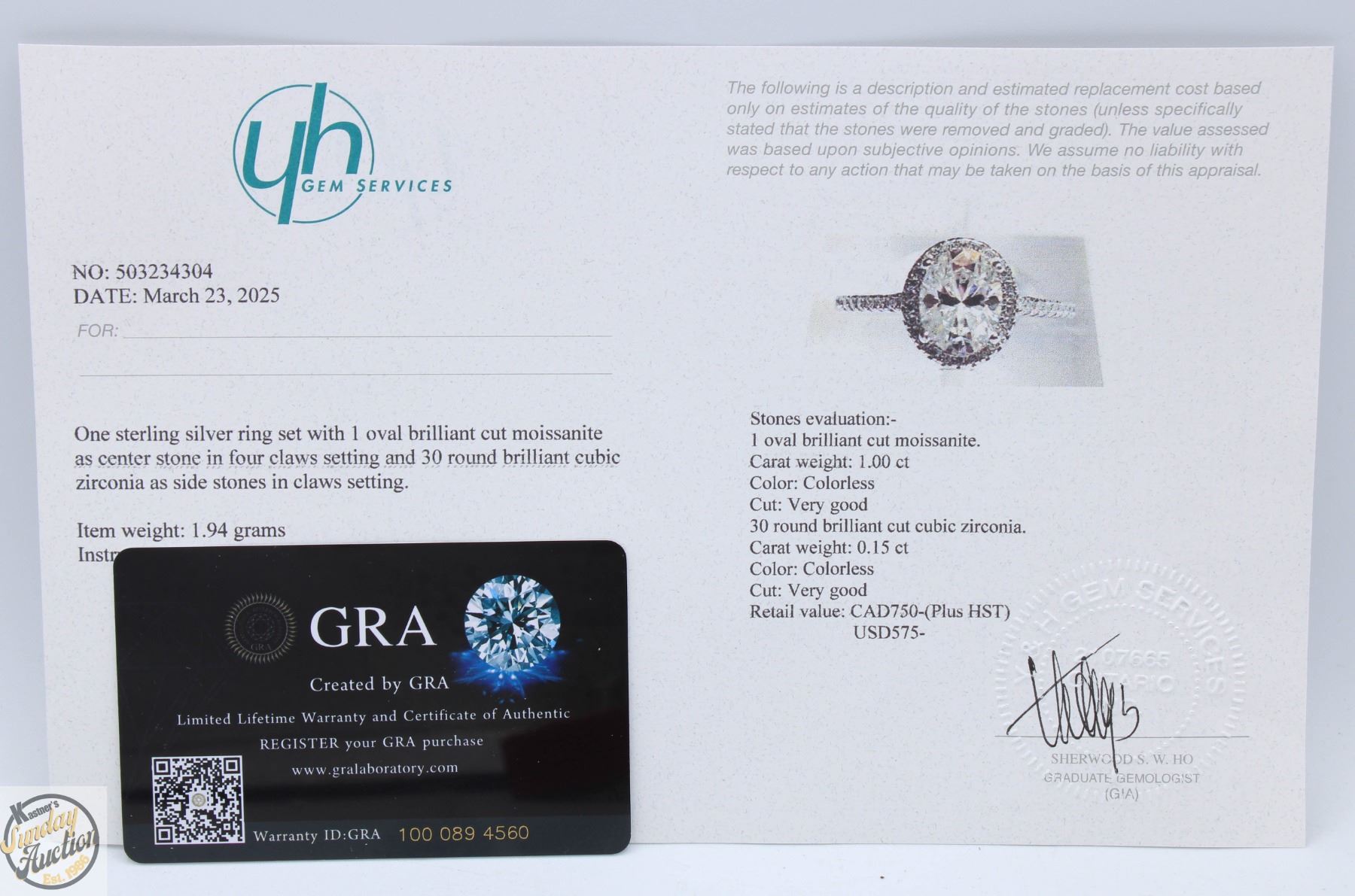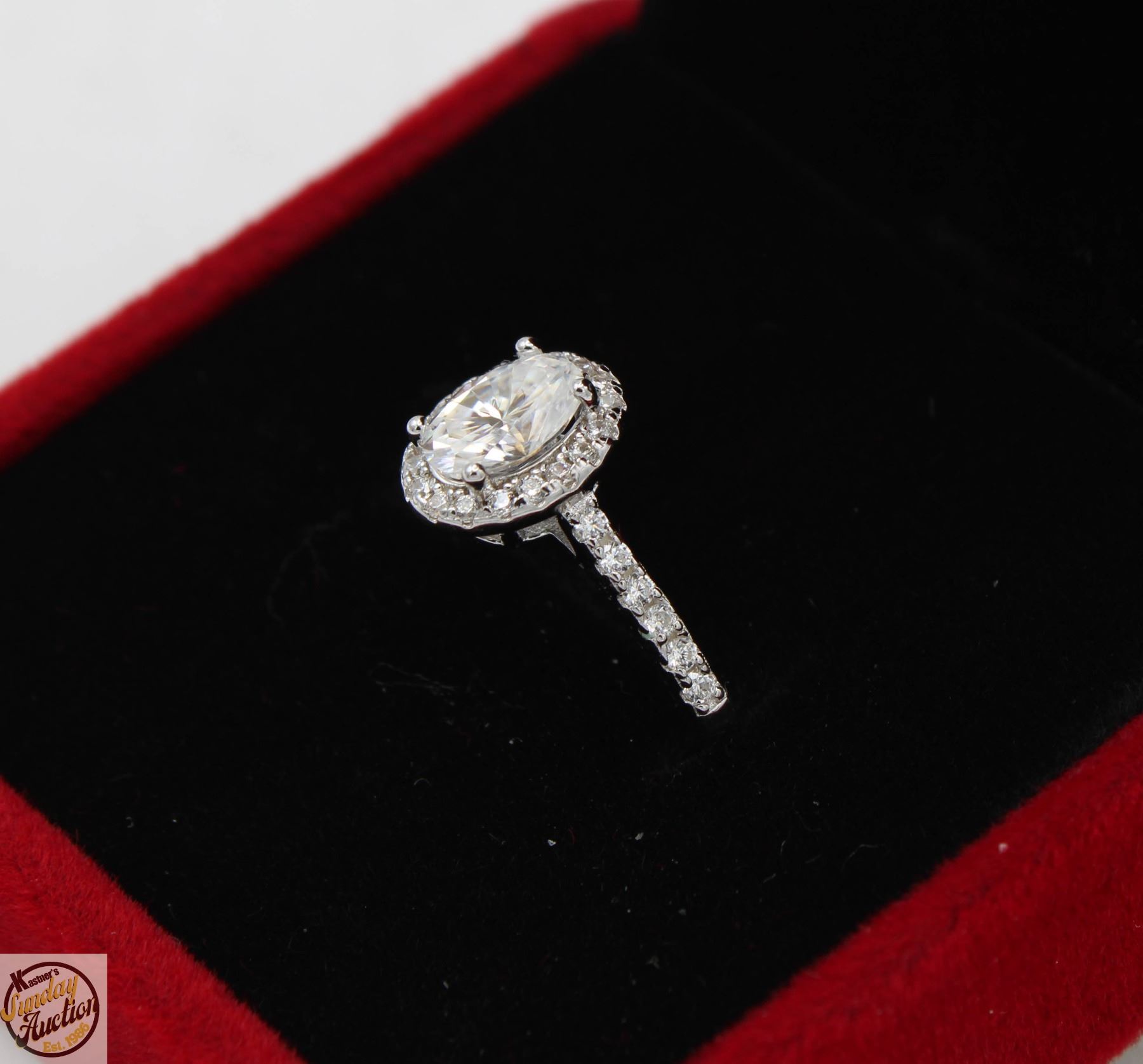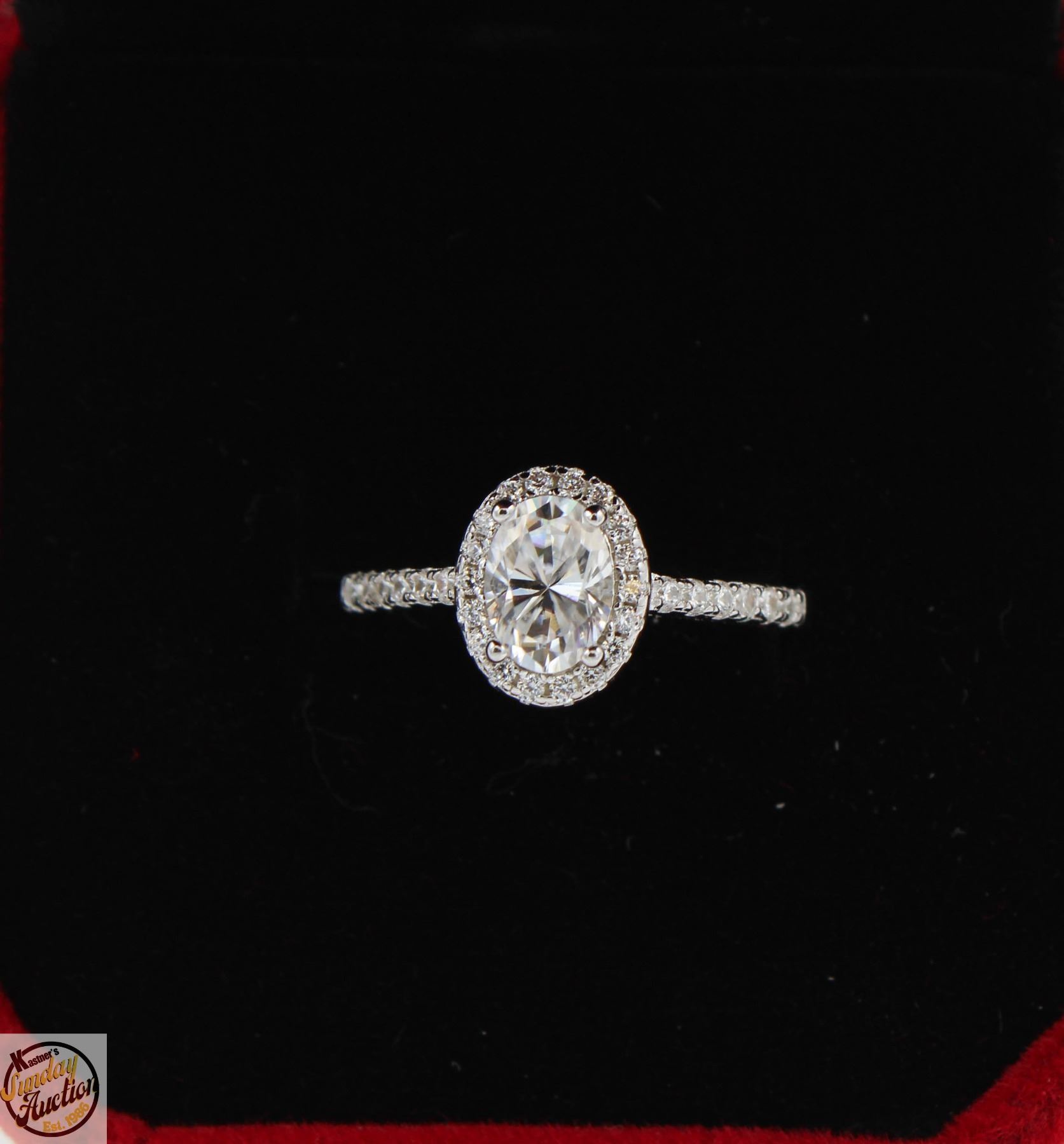 CUT MOISSANITE STONE VVS D COLOR SET WITH 30 ROUND BRILLIANT CUT CUBIC ZIRCONIA SET IN OVAL HALO WITH MORE IN SHANKS SET IN 925 SILVER RING SIZE 5.75 RETAIL VALUE $825.00 **ALL ITEMS MUST BE REMOVED BY 5PM SATURDAY, MAY 10TH 2025. ALL REMAINING ITEMS WILL BE SUBJECT TO A $6.00 PER DAY STORAGE CHARGE. ANY ITEMS REMAINING AFTER MONDAY, MAY 26TH 2025 WILL BE CONSIDERED FORFEITED. NO REFUNDS WILL BE ISSUED FOR FORFEITED ITEMS. TO SCHEDULE A PICK UP APPOINTMENT CLICK HERE