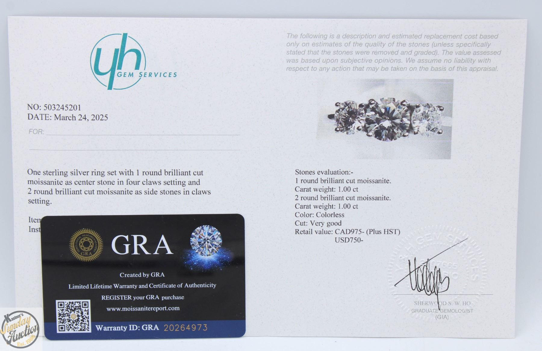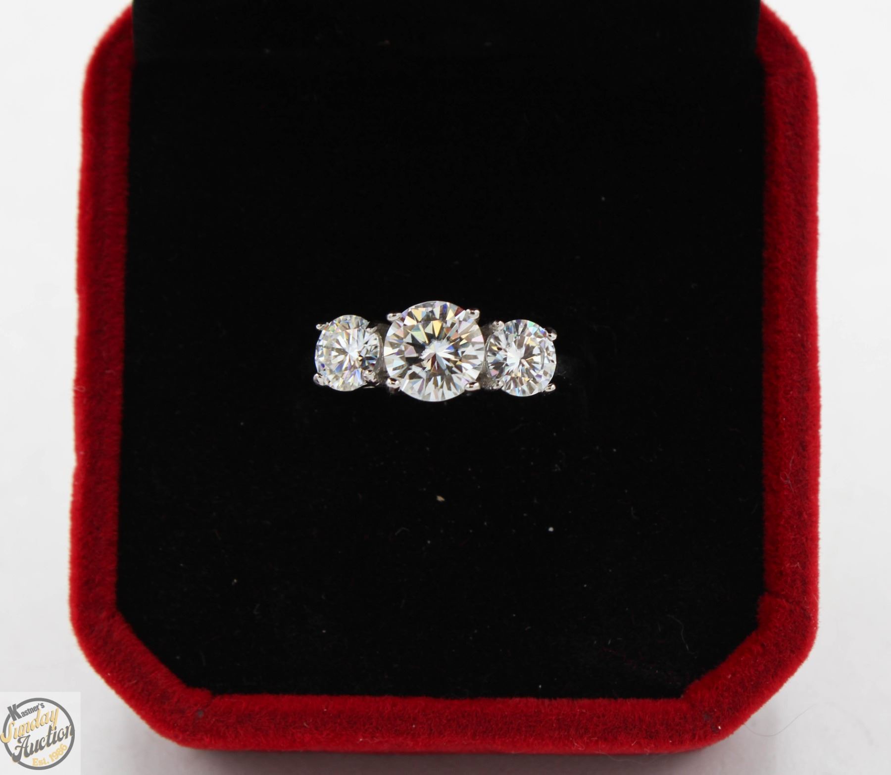 BRILLIANT CUT MOISSANITE STONES VVS D COLOR SET WITH 1.00 CT MOISSANITE SET IN CENTER WITH 0.50 CT SET ON EITHER SIDE SET IN 925 SILVER RING SIZE 6 RETAIL VALUE $975.00 **ALL ITEMS MUST BE REMOVED BY 5PM SATURDAY, MAY 10TH 2025. ALL REMAINING ITEMS WILL BE SUBJECT TO A $6.00 PER DAY STORAGE CHARGE. ANY ITEMS REMAINING AFTER MONDAY, MAY 26TH 2025 WILL BE CONSIDERED FORFEITED. NO REFUNDS WILL BE ISSUED FOR FORFEITED ITEMS. TO SCHEDULE A PICK UP APPOINTMENT CLICK HERE