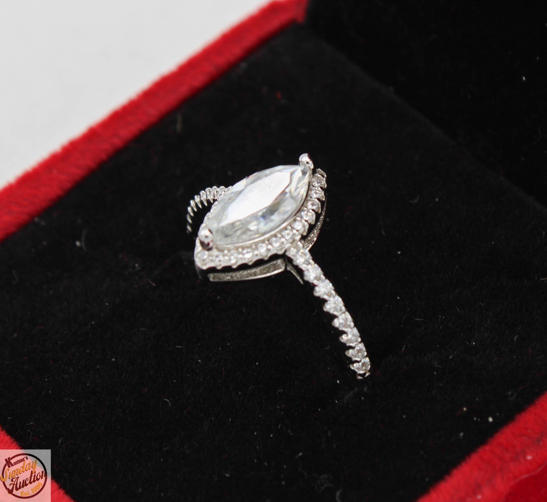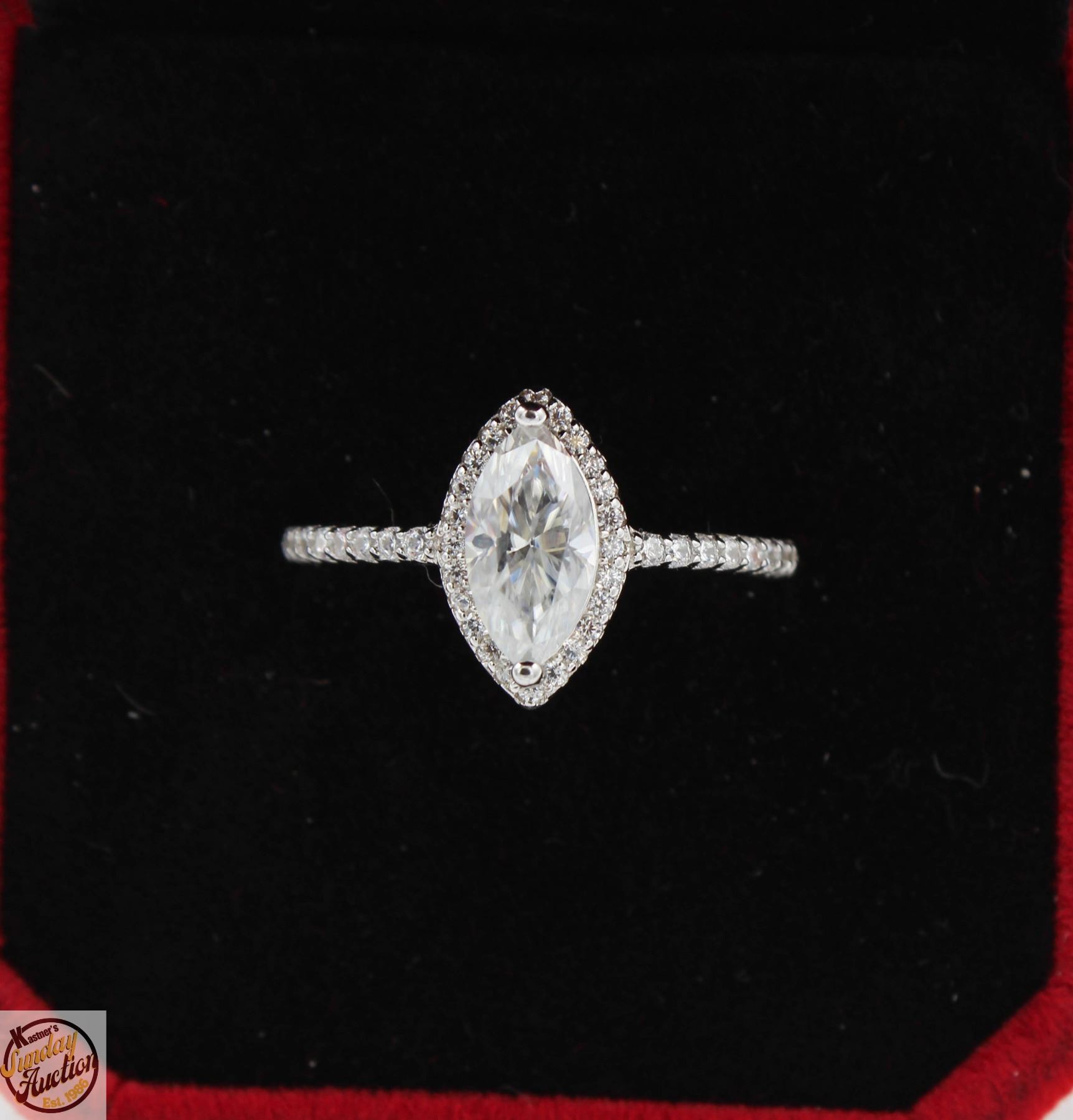 STONE VVS D COLOR WITH 40 ROUND BRILLIANT CUT CUBIC ZIRCONIA SET AROUND MARQUISE SHAPED HALO WITH MORE SET IN THE SHANK SET IN 925 SILVER RING SIZE 7.75 RETAIL VALUE $825.00 **ALL ITEMS MUST BE REMOVED BY 5PM SATURDAY, MAY 17TH 2025. ALL REMAINING ITEMS WILL BE SUBJECT TO A $6.00 PER DAY STORAGE CHARGE. ANY ITEMS REMAINING AFTER MONDAY, JUNE 2ND 2025 WILL BE CONSIDERED FORFEITED. NO REFUNDS WILL BE ISSUED FOR FORFEITED ITEMS. TO SCHEDULE A PICK UP APPOINTMENT CLICK HERE