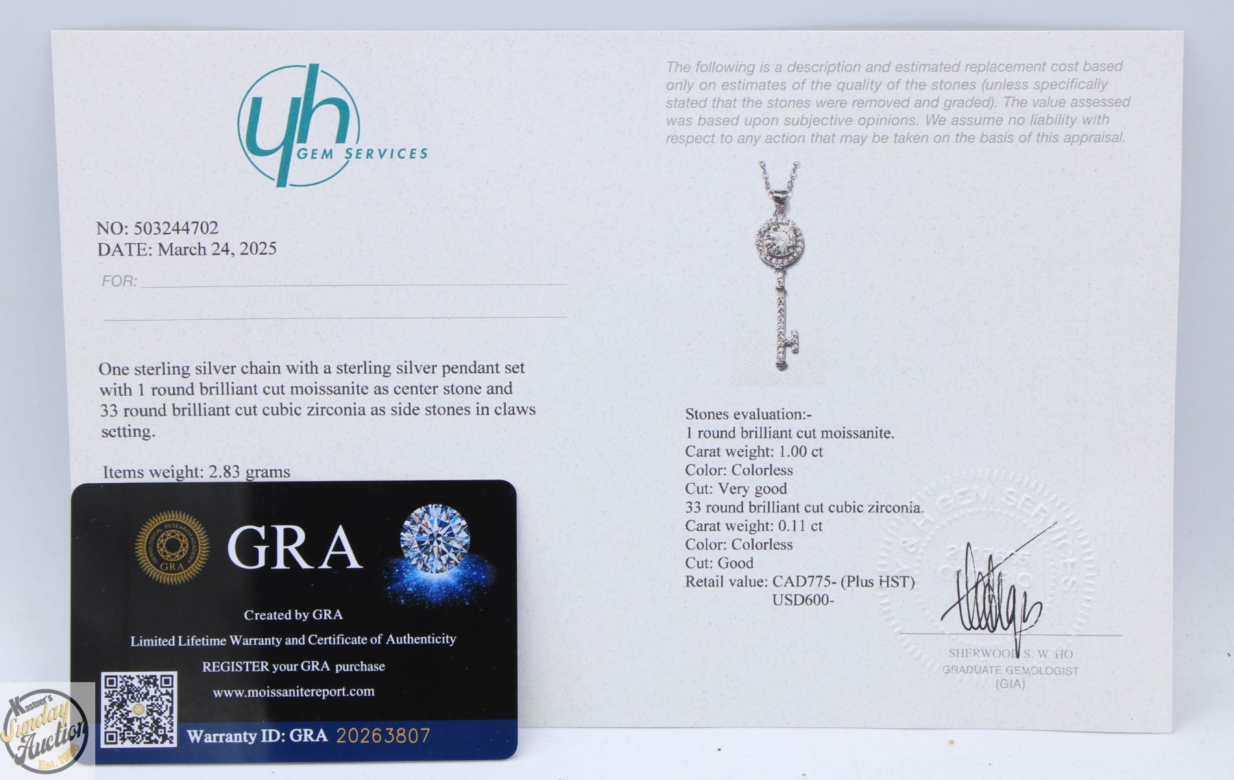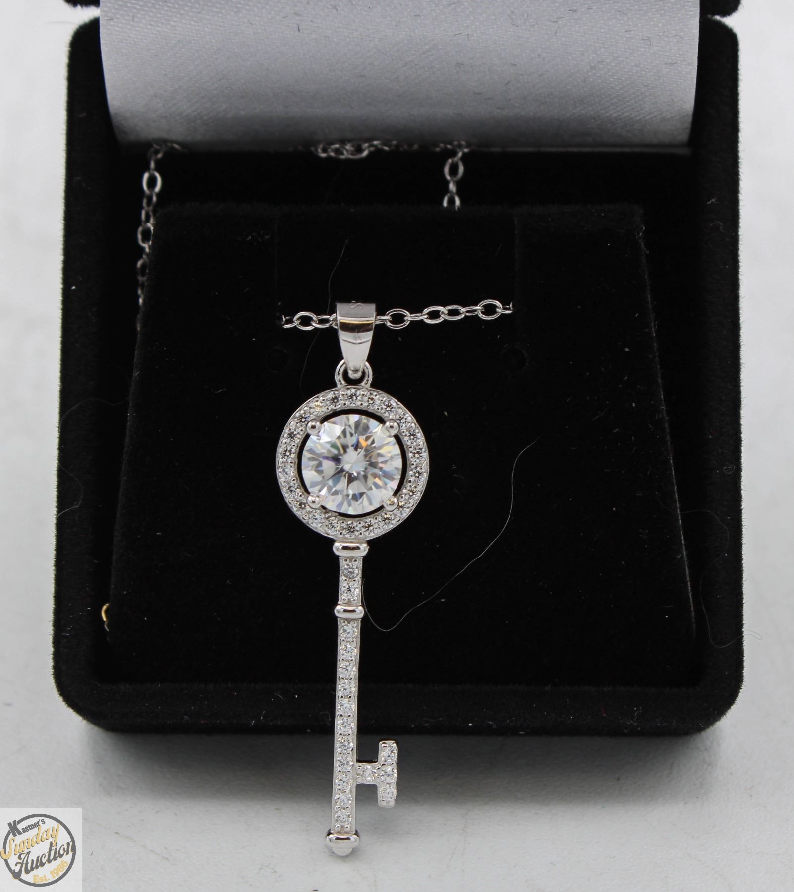 CUT MOISSANITE STONE VVS D COLOR WITH 33 ROUND BRILLIANT CUT CUBIC ZIRCONIA SET IN ROUND HALO AND MORE SET INTO KEY SHAPE SET IN 925 SILVER PENDANT RETAIL VALUE $775.00 **ALL ITEMS MUST BE REMOVED BY 5PM SATURDAY, MAY 10TH 2025. ALL REMAINING ITEMS WILL BE SUBJECT TO A $6.00 PER DAY STORAGE CHARGE. ANY ITEMS REMAINING AFTER MONDAY, MAY 26TH 2025 WILL BE CONSIDERED FORFEITED. NO REFUNDS WILL BE ISSUED FOR FORFEITED ITEMS. TO SCHEDULE A PICK UP APPOINTMENT CLICK HERE