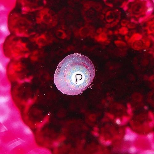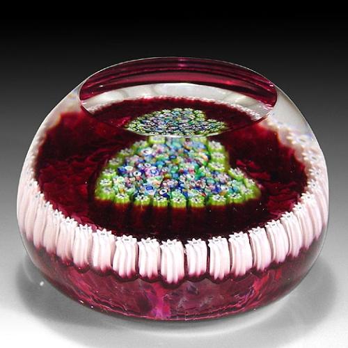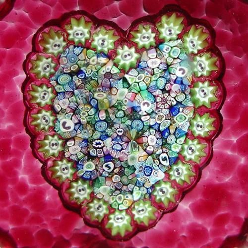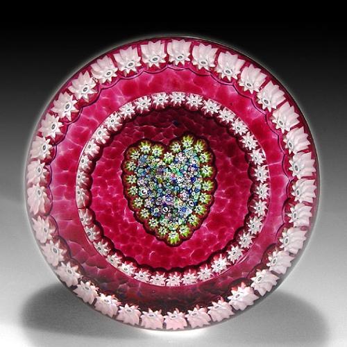 Perthshire Paperweights close packed millefiori heart paperweight, with a central heart-shaped arrangement of assorted complex canes, encircled by a pale pink millefiori border garland, on translucent ruby ground. Circular top facet. Signature cane on the base. Diameter 2 3/8". NO RESERVE