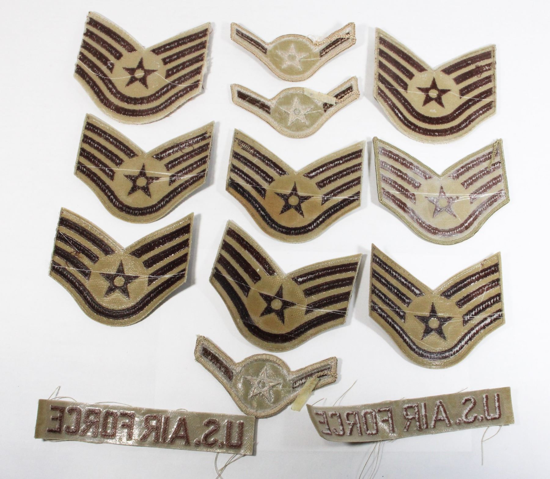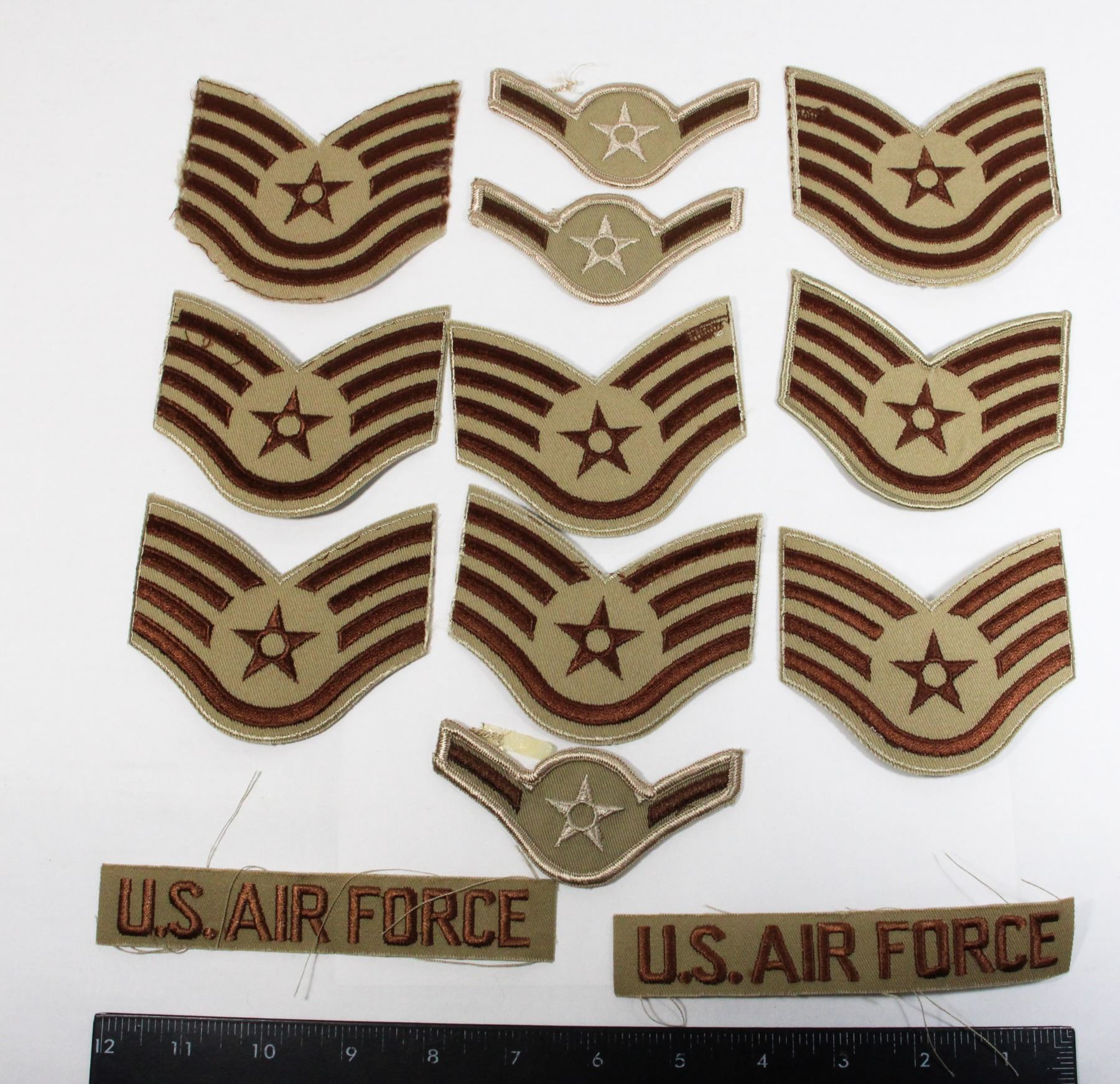 TAN COLOUR LOT OF 12 UNITED STATES AIR FORCE USAF INCLUDING CHEVRON RANK INSIGNIA UNITED STATES OF AMERICA UNIFORM INSIGNIA