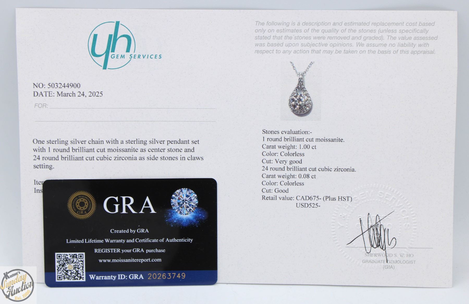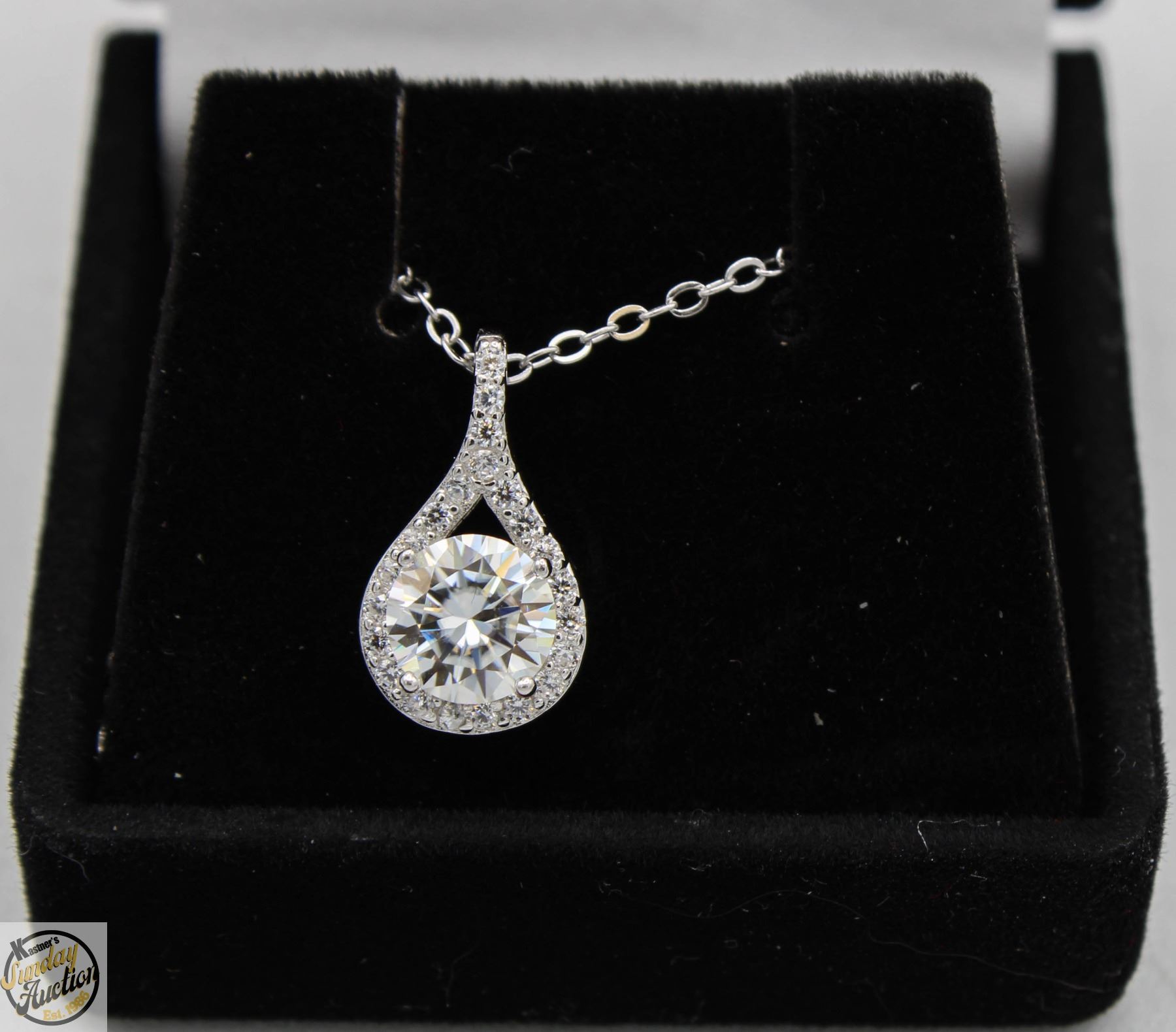 MOISSANITE STONE VVS D COLOR WITH 24 ROUND BRILLIANT CUT CUBIC ZIRCONIA SET IN TEAR DROP HALO SET IN 925 SILVER PENDANT RETAIL VALUE $675.00 **ALL ITEMS MUST BE REMOVED BY 5PM SATURDAY, MAY 17TH 2025. ALL REMAINING ITEMS WILL BE SUBJECT TO A $6.00 PER DAY STORAGE CHARGE. ANY ITEMS REMAINING AFTER MONDAY, JUNE 2ND 2025 WILL BE CONSIDERED FORFEITED. NO REFUNDS WILL BE ISSUED FOR FORFEITED ITEMS. TO SCHEDULE A PICK UP APPOINTMENT CLICK HERE