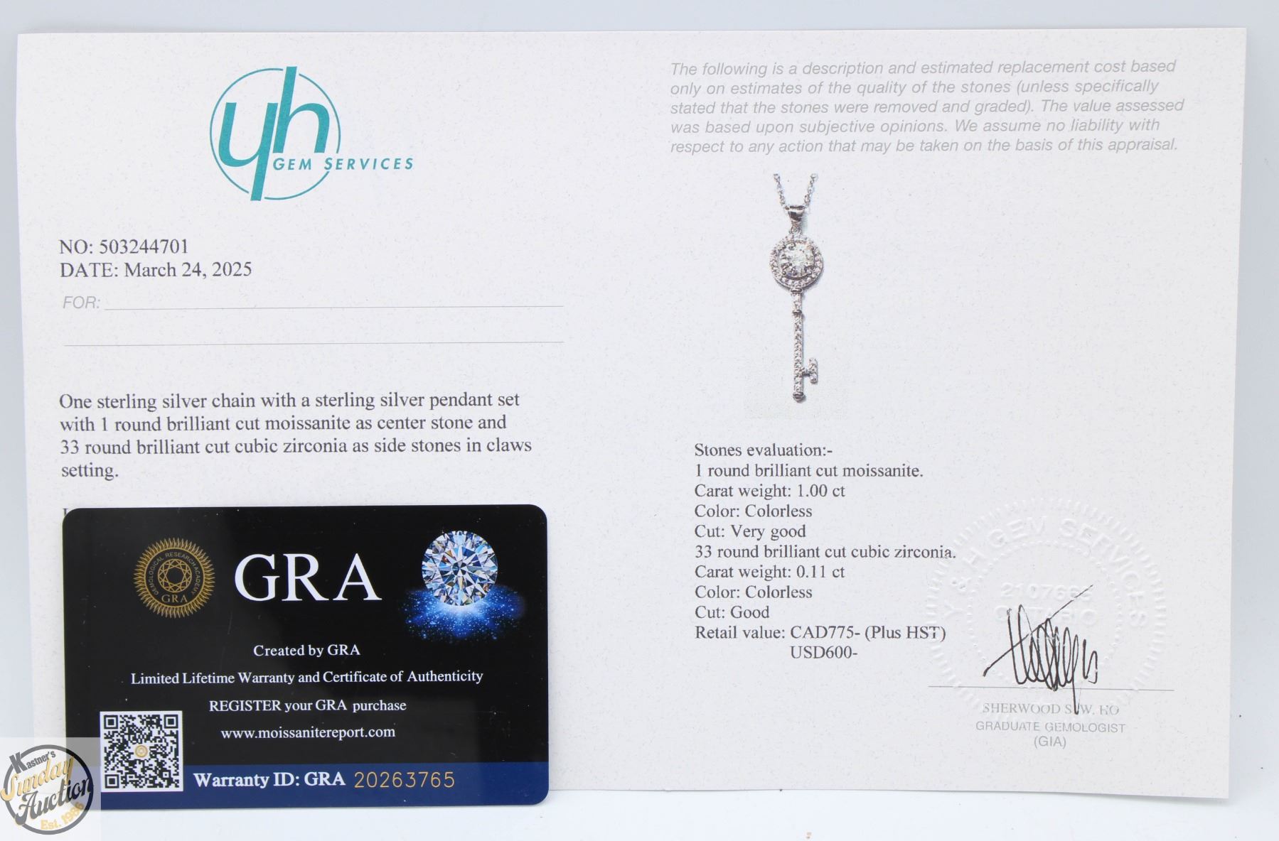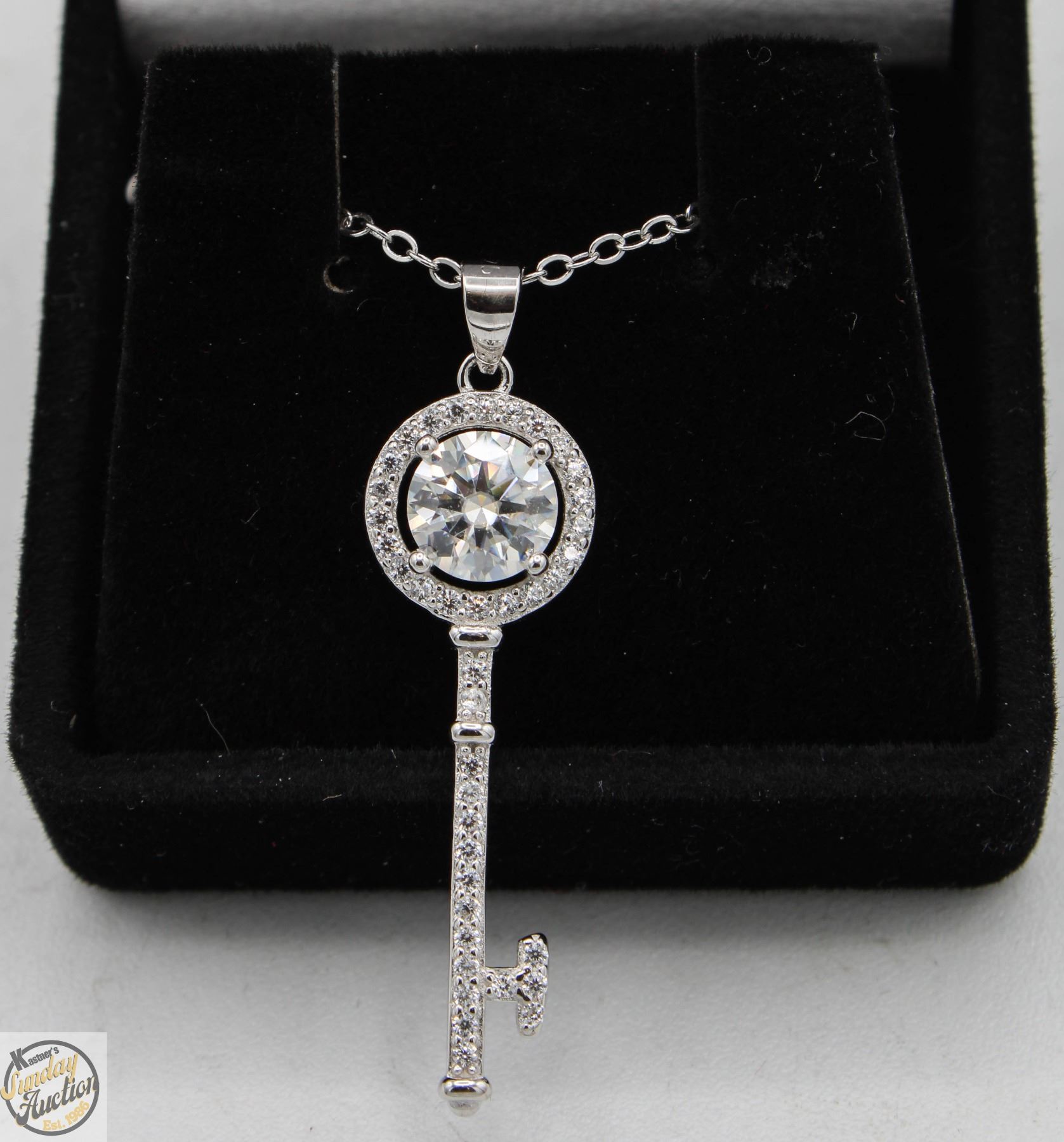 MOISSANITE STONE VVS D COLOR WITH 33 ROUND BRILLIANT CUT CUBIC ZIRCONIA SET IN ROUND HALO AND MORE SET INTO KEY SHAPE SET IN 925 SILVER PENDANT RETAIL VALUE $775.00 **ALL ITEMS MUST BE REMOVED BY 5PM SATURDAY, MAY 17TH 2025. ALL REMAINING ITEMS WILL BE SUBJECT TO A $6.00 PER DAY STORAGE CHARGE. ANY ITEMS REMAINING AFTER MONDAY, JUNE 2ND 2025 WILL BE CONSIDERED FORFEITED. NO REFUNDS WILL BE ISSUED FOR FORFEITED ITEMS. TO SCHEDULE A PICK UP APPOINTMENT CLICK HERE