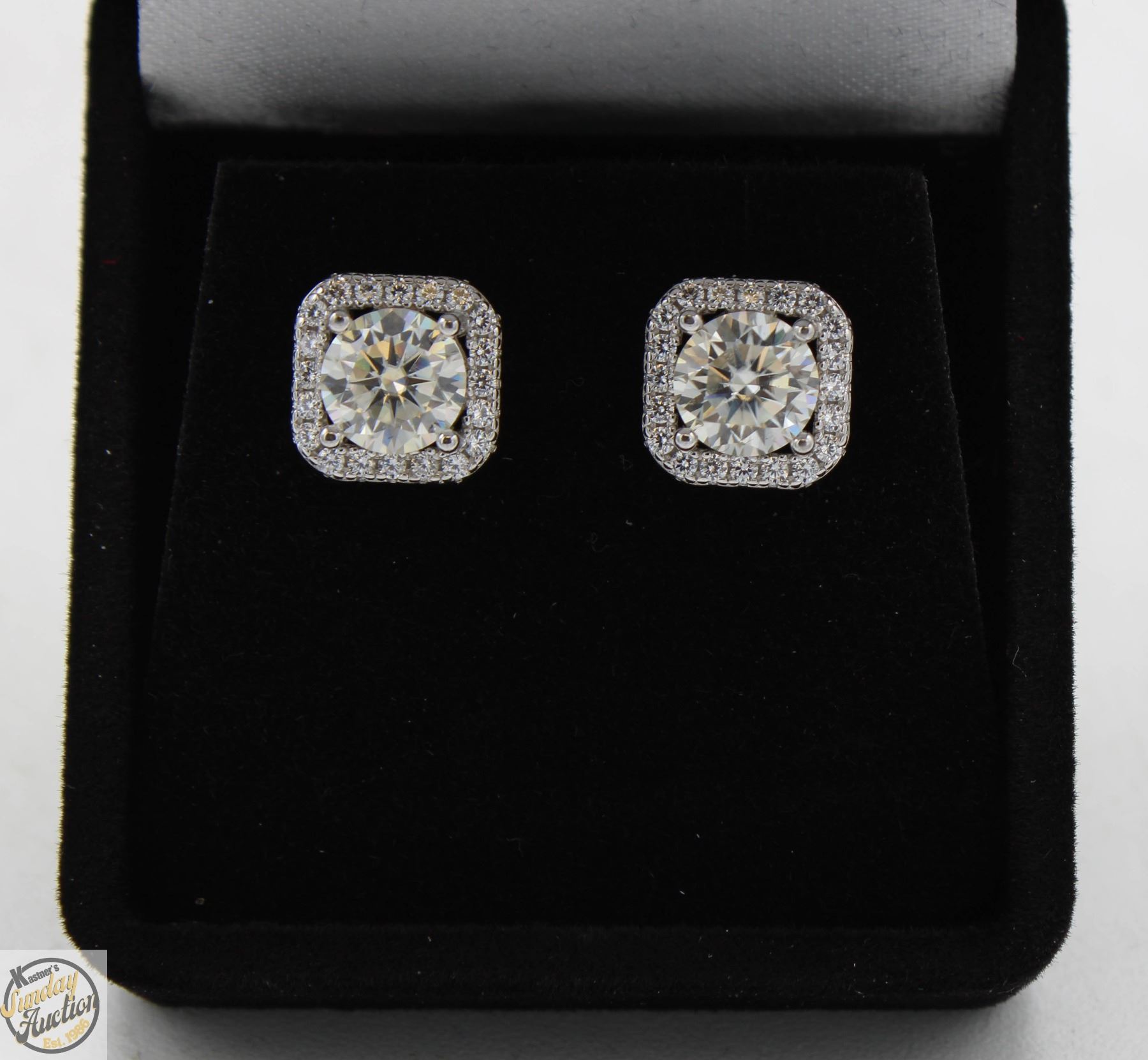 BRILLIANT CUT MOISSANITE STONES VVS D COLOR WITH 48 ROUND BRILLIANT CUT CUBIC ZIRCONIA SET IN SQUARE HALOS SET IN 925 SILVER EARRINGS RETAIL VALUE $950.00 **ALL ITEMS MUST BE REMOVED BY 5PM SATURDAY, MAY 10TH 2025. ALL REMAINING ITEMS WILL BE SUBJECT TO A $6.00 PER DAY STORAGE CHARGE. ANY ITEMS REMAINING AFTER MONDAY, MAY 26TH 2025 WILL BE CONSIDERED FORFEITED. NO REFUNDS WILL BE ISSUED FOR FORFEITED ITEMS. TO SCHEDULE A PICK UP APPOINTMENT CLICK HERE