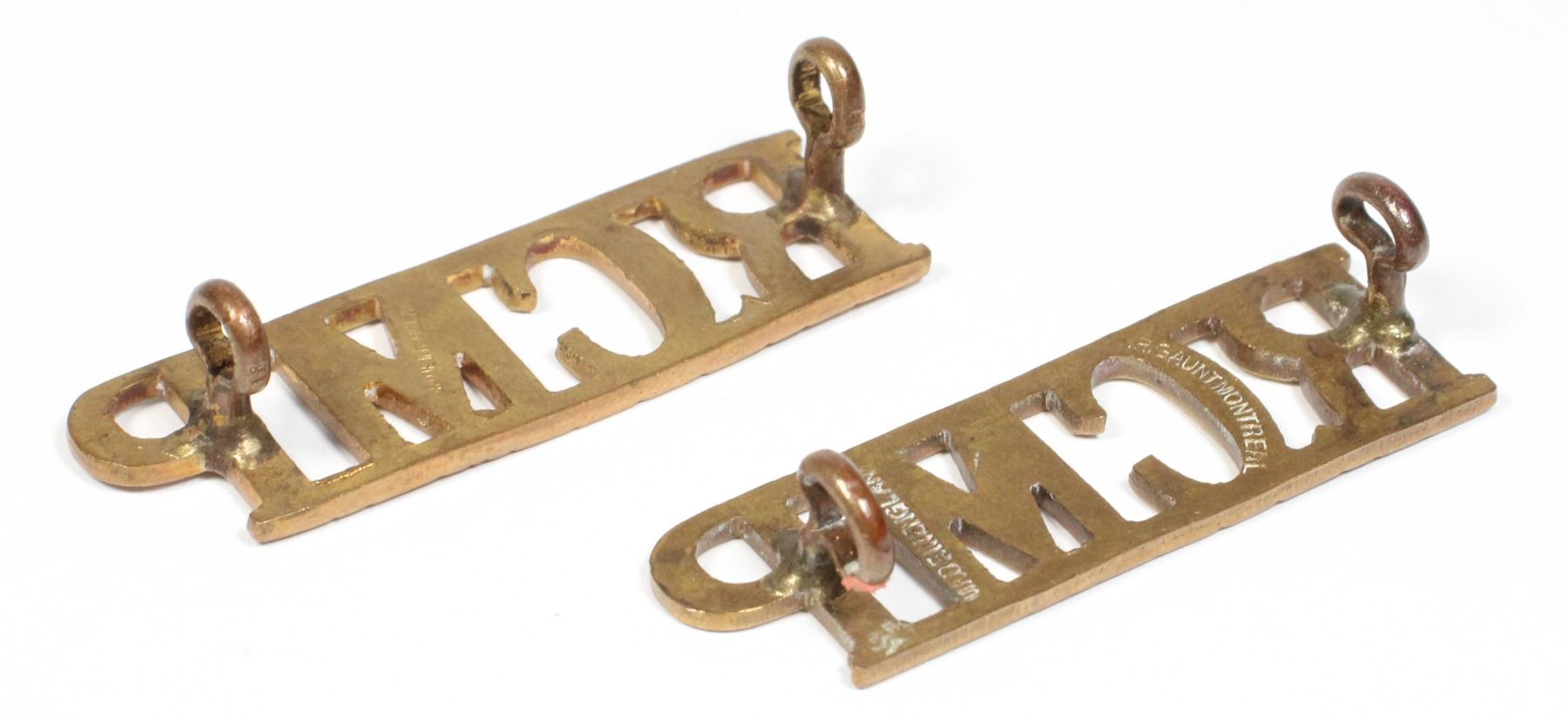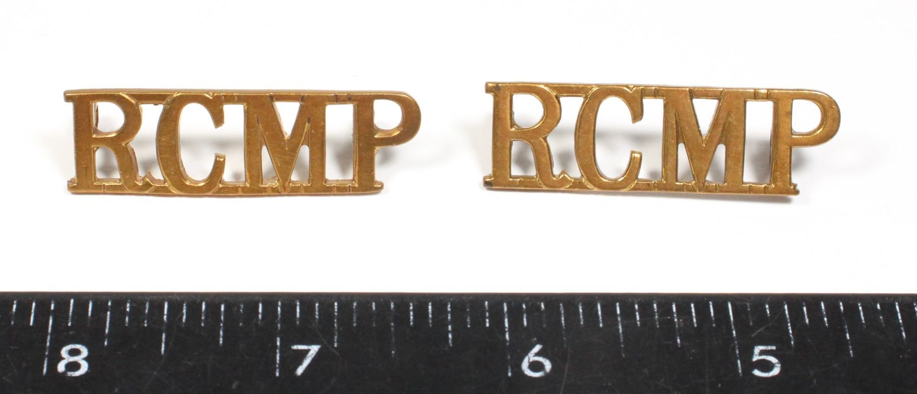 BOTH MARKED "MADE IN ENGLAND", ONE HAS "J.R. GAUNT MONTREAL" MARKING IN UNUSUAL CURVED STYLE BEHIND "C", BOTH HAVE LUGS- ROYAL CANADIAN MOUNTED POLICE SHOULDER TITLES
