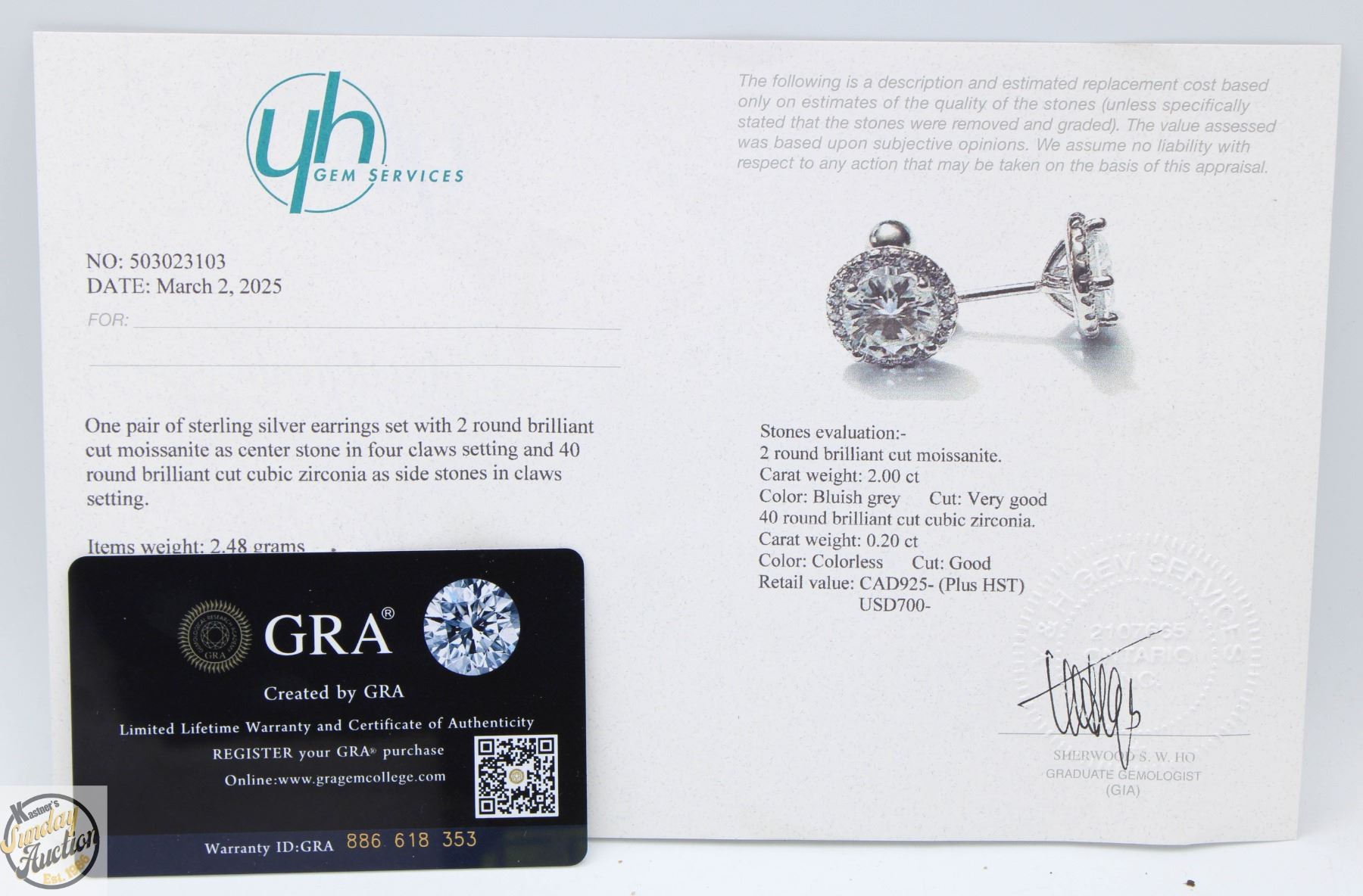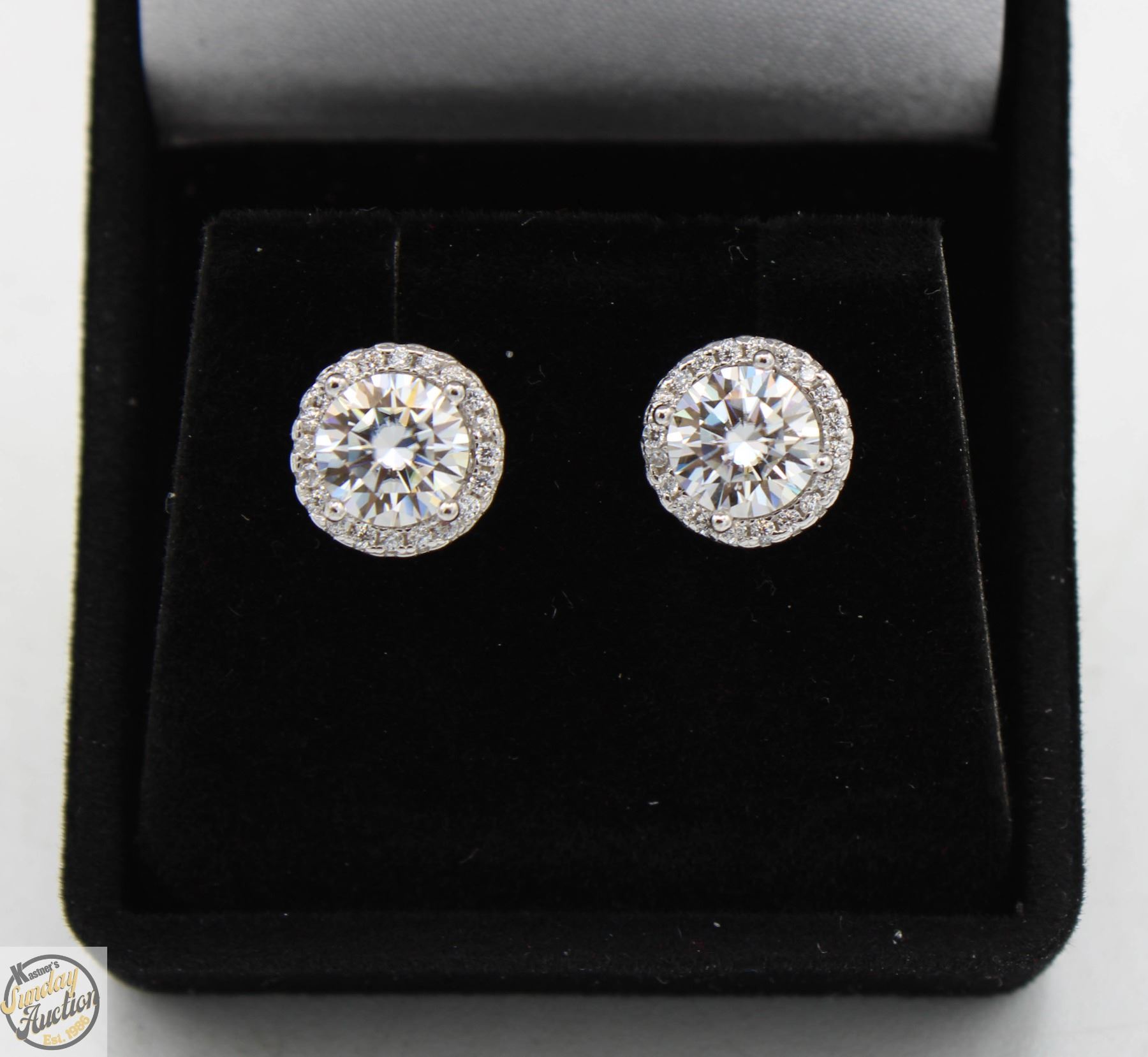 MOISSANITE STONES VVS D COLOR WITH 40 ROUND BRILLIANT CUT CUBIC ZIRCONIA SET IN ROUND HALOS SET IN 925 SILVER EARRINGS RETAIL VALUE $925.00 **ALL ITEMS MUST BE REMOVED BY 5PM SATURDAY, MAY 17TH 2025. ALL REMAINING ITEMS WILL BE SUBJECT TO A $6.00 PER DAY STORAGE CHARGE. ANY ITEMS REMAINING AFTER MONDAY, JUNE 2ND 2025 WILL BE CONSIDERED FORFEITED. NO REFUNDS WILL BE ISSUED FOR FORFEITED ITEMS. TO SCHEDULE A PICK UP APPOINTMENT CLICK HERE