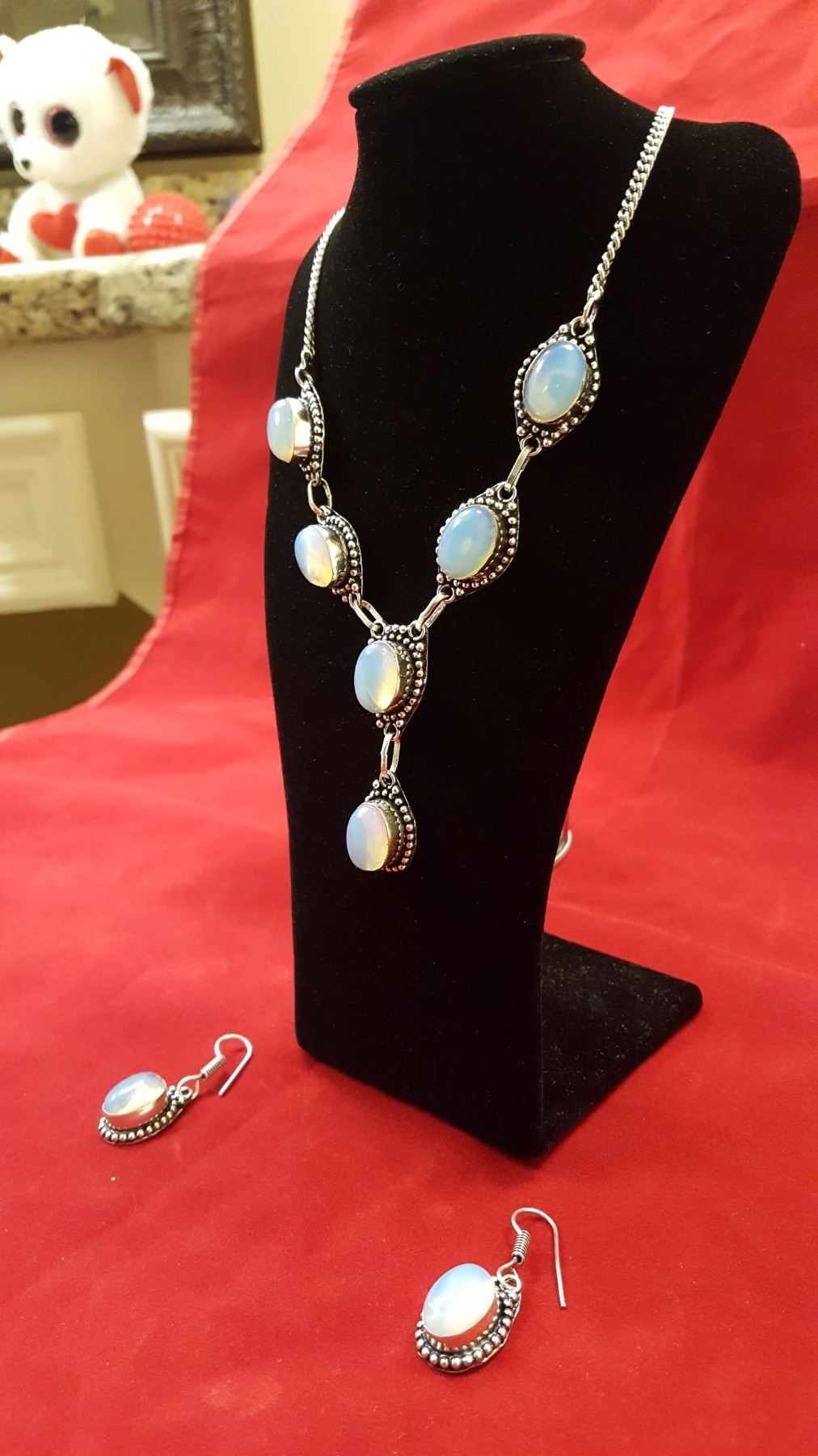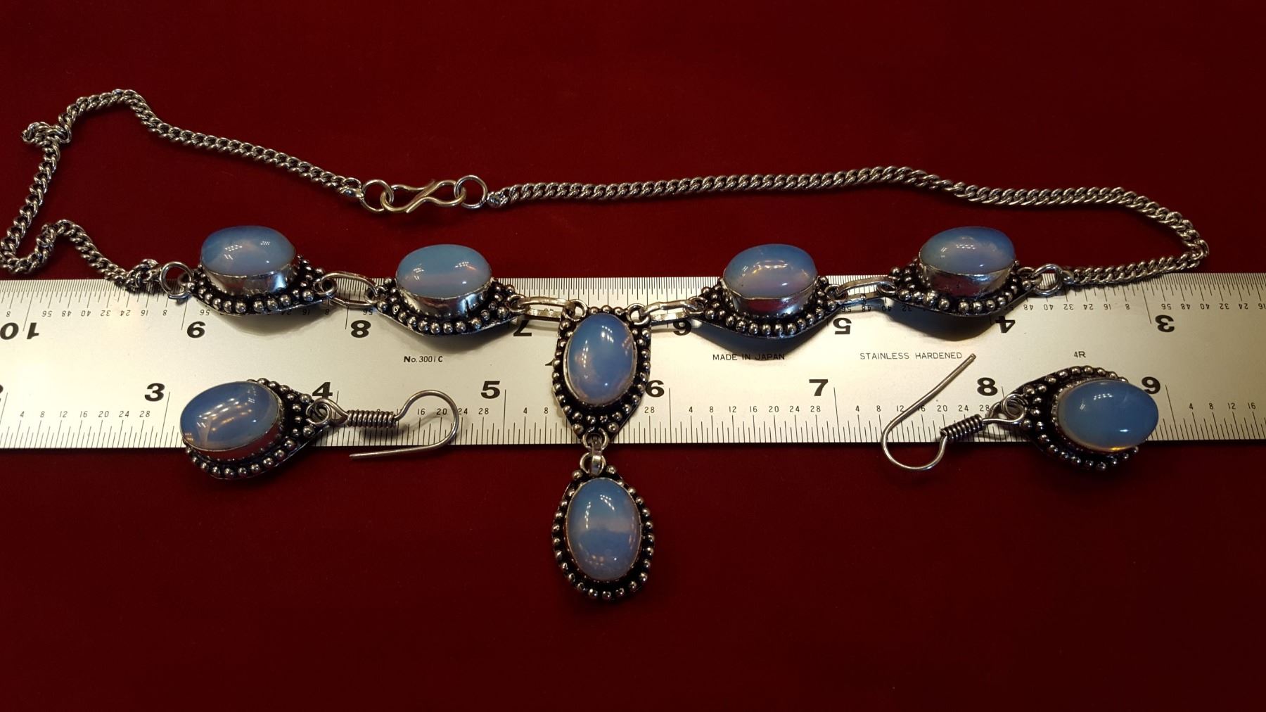 Beautiful 257ctw opalatite necklace and earring set.  Mounted in heavy .925 sterling silver. 18" long . This opal necklace set just bursts out with a full spectrum of color play.