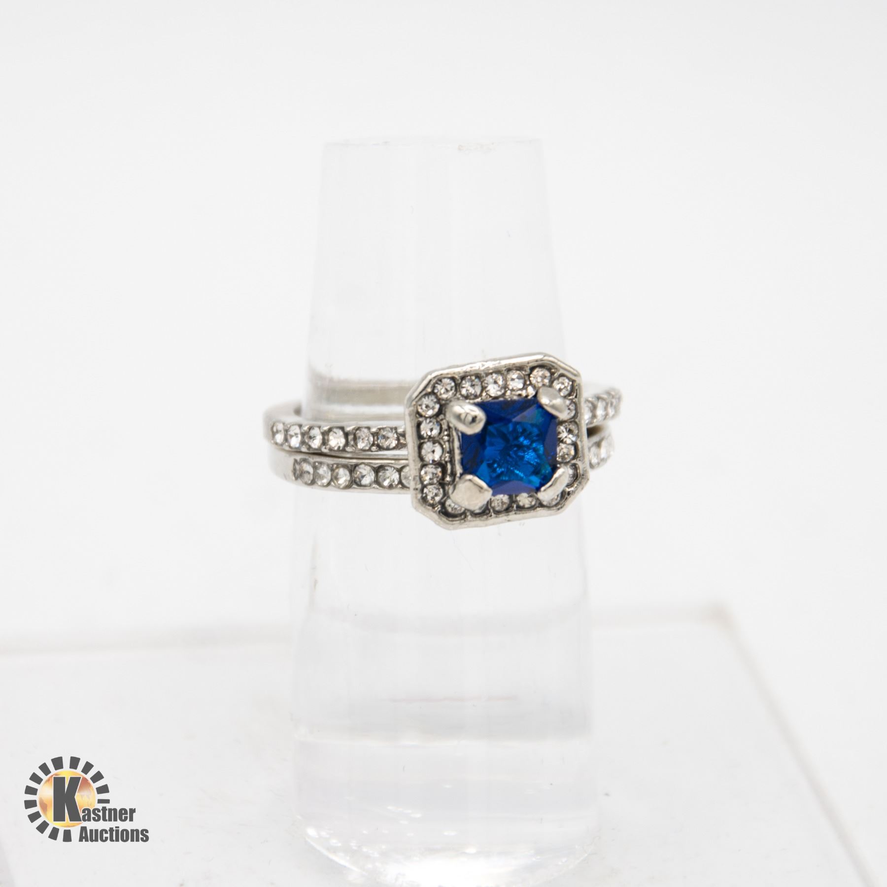 CLEAR STONES IN A SQUARE SHAPED HALO WITH CLEAR STONES IN SHANK OF BOTH RINGS. SIZE 8