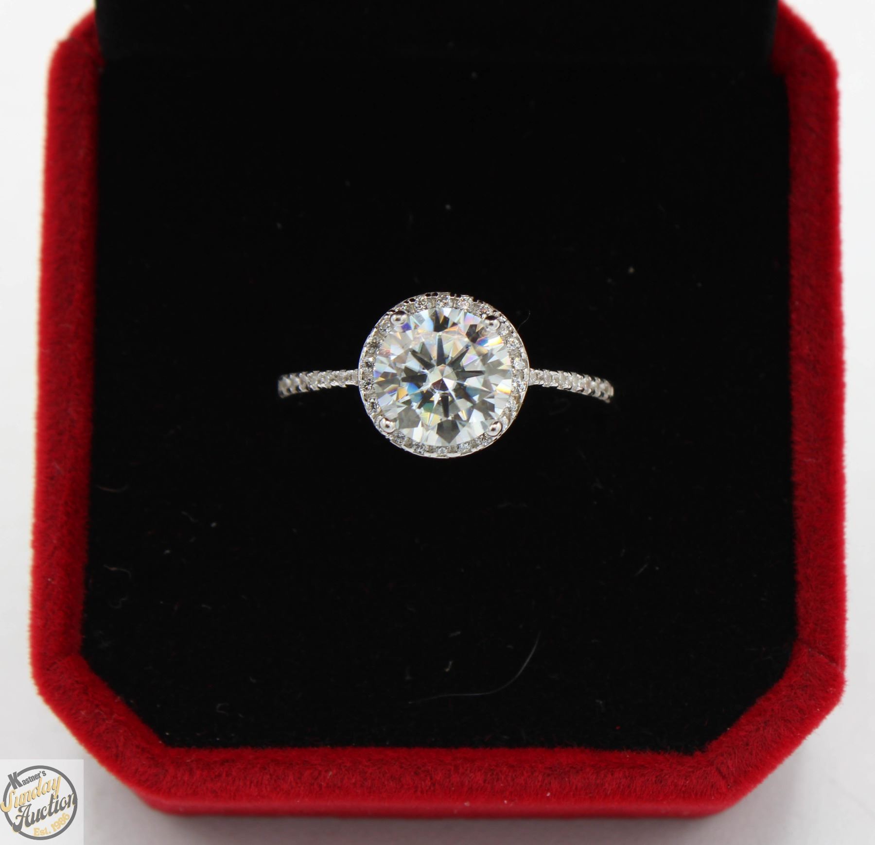 MOISSANITE STONE VVS D COLOR SET WITH 35 ROUND BRILLIANT CUT CUBIC ZIRCONIA SET IN ROUND HALO WITH MORE SET IN SHANK SET IN 925 SILVER RING SIZE 7 RETAIL VALUE $1,050.00 **ALL ITEMS MUST BE REMOVED BY 5PM SATURDAY, MAY 24TH 2025. ALL REMAINING ITEMS WILL BE SUBJECT TO A $6.00 PER DAY STORAGE CHARGE. ANY ITEMS REMAINING AFTER MONDAY, JUNE 9TH 2025 WILL BE CONSIDERED FORFEITED. NO REFUNDS WILL BE ISSUED FOR FORFEITED ITEMS. TO SCHEDULE A PICK UP APPOINTMENT CLICK HERE