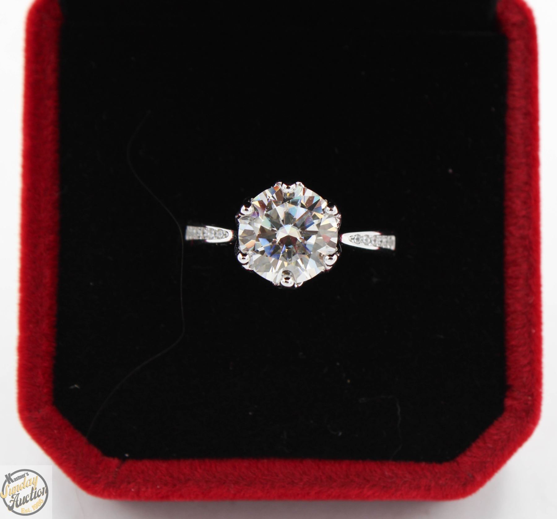 MOISSANITE STONE VVS D COLOR WITH 12 ROUND BRILLIANT CUT CUBIC ZIRCONIA SET IN SHANKS SET IN 925 SILVER RING SIZE 7 RETAIL VALUE $1,125.00 **ALL ITEMS MUST BE REMOVED BY 5PM SATURDAY, MAY 24TH 2025. ALL REMAINING ITEMS WILL BE SUBJECT TO A $6.00 PER DAY STORAGE CHARGE. ANY ITEMS REMAINING AFTER MONDAY, JUNE 9TH 2025 WILL BE CONSIDERED FORFEITED. NO REFUNDS WILL BE ISSUED FOR FORFEITED ITEMS. TO SCHEDULE A PICK UP APPOINTMENT CLICK HERE