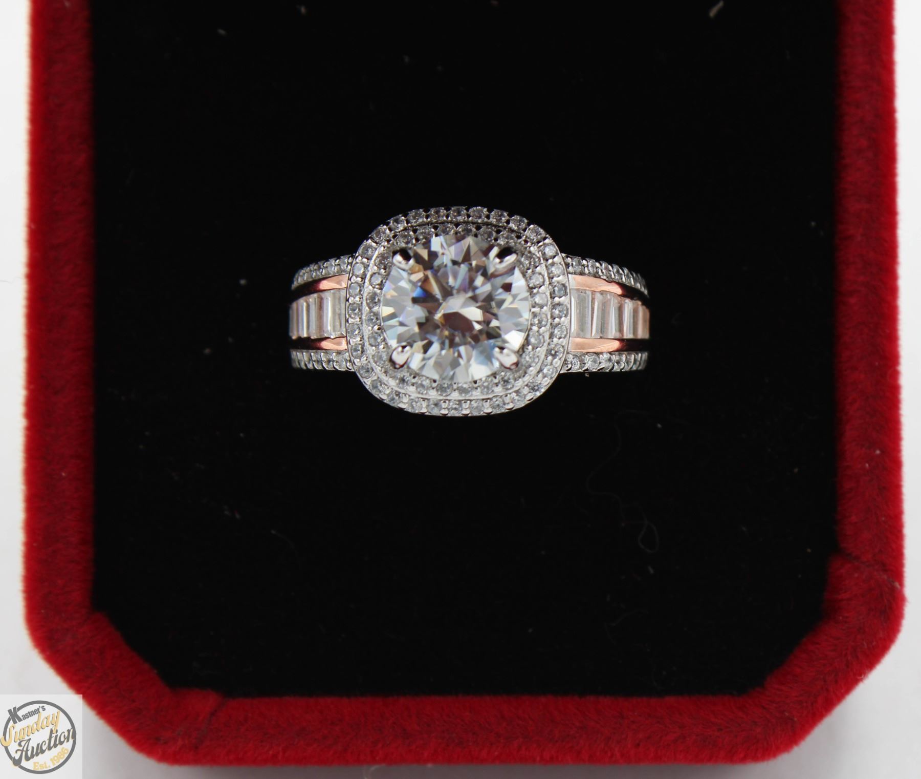 MOISSANITE STONE VVS D COLOR SET WITH 88 ROUND BRILLIANT CUT CUBIC ZIRCONIA SET IN ROUND HALO WITH MORE IN SHANKS WITH 12 BAGUETTE CZS SET IN 925 SILVER RING SIZE 7 RETAIL VALUE $975.00 **ALL ITEMS MUST BE REMOVED BY 5PM SATURDAY, MAY 24TH 2025. ALL REMAINING ITEMS WILL BE SUBJECT TO A $6.00 PER DAY STORAGE CHARGE. ANY ITEMS REMAINING AFTER MONDAY, JUNE 9TH 2025 WILL BE CONSIDERED FORFEITED. NO REFUNDS WILL BE ISSUED FOR FORFEITED ITEMS. TO SCHEDULE A PICK UP APPOINTMENT CLICK HERE